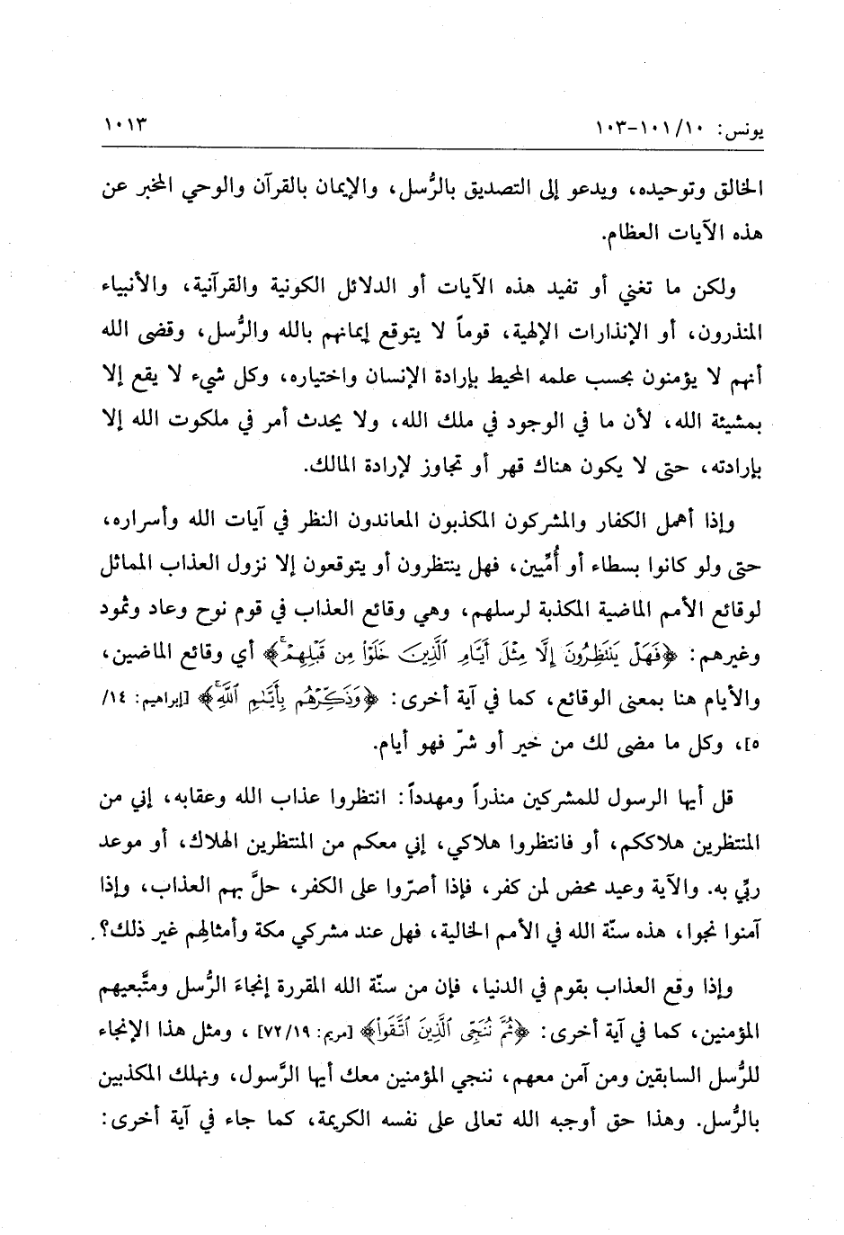 ولكن ما تغني أو تفيد هذه الآيات أو الدلائل الكونية والقرآنية، والأنبياء المنذرون، أو الإنذارات الإلهية، قوما لا يتوقع إيمانهم بالله والرّسل، وقضى الله أنهم لا يؤمنون بحسب علمه المحيط بإرادة الإنسان واختياره، وكل شيء لا يقع إلا بمشيئة الله، لأن ما في الوجود في ملك الله، ولا يحدث أمر في ملكوت الله إلا بإرادته، حتى لا يكون هناك قهرا أو تجاوز لإرادة المالك.
