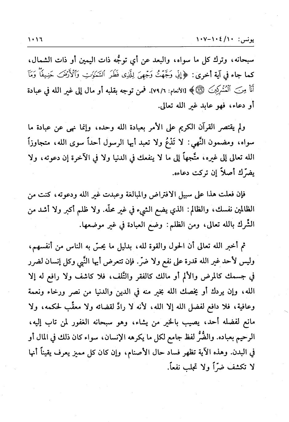 ولم يقتصر القرآن الكريم على الأمر بعبادة الله وحده، وإنما نهى عن عبادة ما سواه، ومضمون النّهي: لا تدع ولا تعبد أيها الرسول أحدا سوى الله، متجاوزا الله تعالى إلى غيره، متّجها إلى ما لا ينفعك في الدنيا ولا في الآخرة إن دعوته، ولا يضرّك أصلا إن تركت دعاءه.