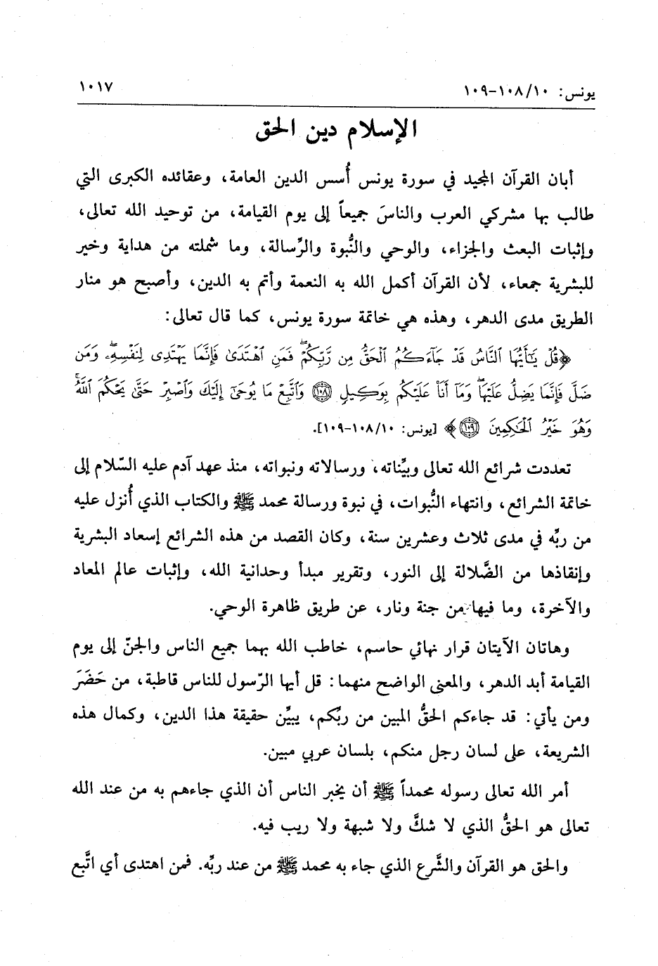 أبان القرآن المجيد في سورة يونس أسس الدين العامة، وعقائده الكبرى التي طالب بها مشركي العرب والناس جميعا إلى يوم القيامة، من توحيد الله تعالى، وإثبات البعث والجزاء، والوحي والنّبوة والرّسالة، وما شملته من هداية وخير للبشرية جمعاء، لأن القرآن أكمل الله به النعمة وأتم به الدين، وأصبح هو منار الطريق مدى الدهر، وهذه هي خاتمة سورة يونس، كما قال تعالى: