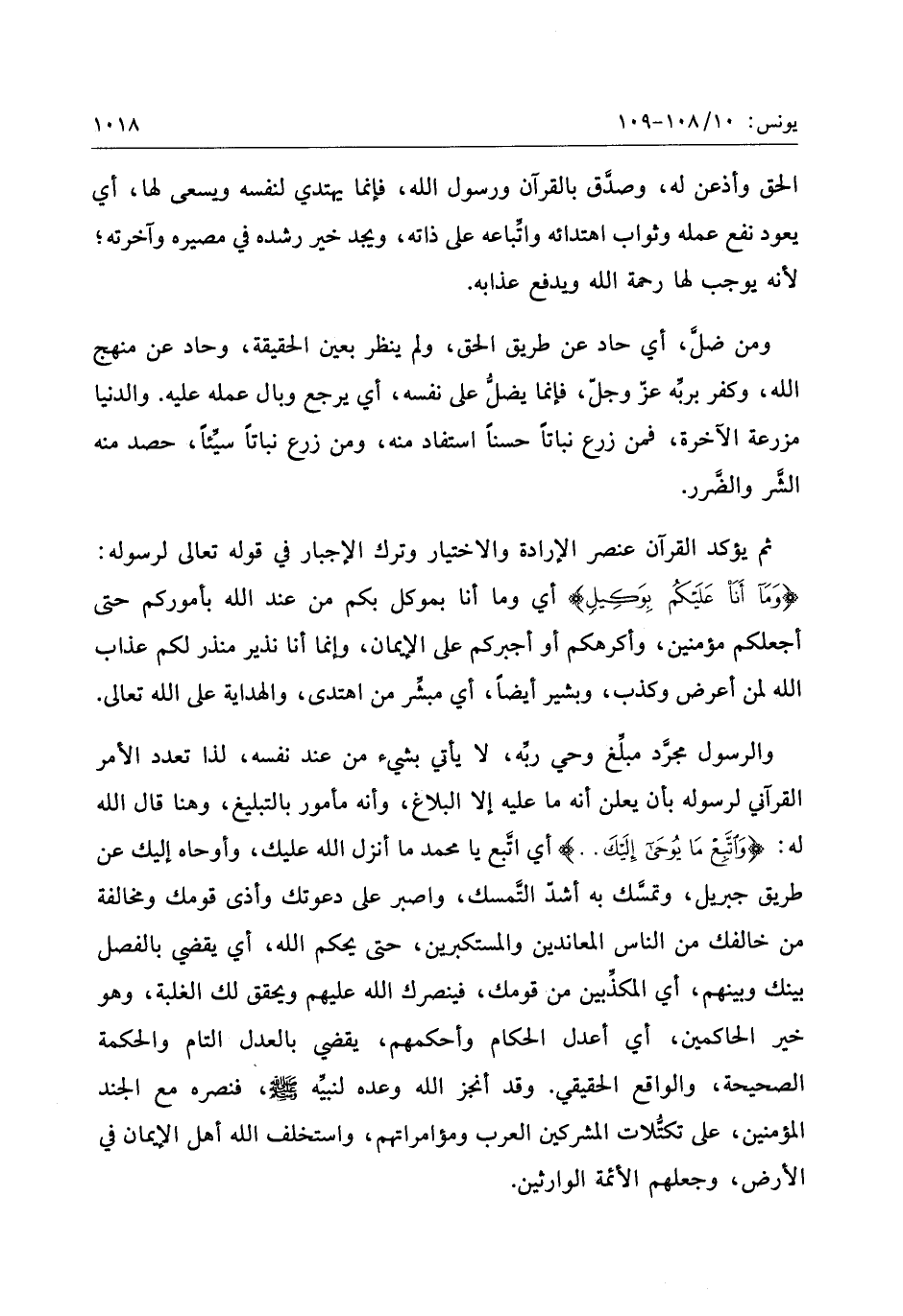 والرسول مجرّد مبلّغ وحي ربّه، لا يأتي بشيء من عند نفسه، لذا تعدد الأمر القرآني لرسوله بأن يعلن أنه ما عليه إلا البلاغ، وأنه مأمور بالتبليغ، وهنا قال الله له: وَاتَّبِعْ ما يُوحى إِلَيْكَ.. أي اتّبع يا محمد ما أنزل الله عليك، وأوحاه إليك عن طريق جبريل، وتمسّك به أشدّ التّمسّك، واصبر على دعوتك وأذى قومك ومخالفة من خالفك من الناس المعاندين والمستكبرين، حتى يحكم الله، أي يقضي بالفصل بينك وبينهم، أي المكذّبين من قومك، فينصرك الله عليهم ويحقق لك الغلبة، وهو خير الحاكمين، أي أعدل الحكام وأحكمهم، يقضي بالعدل التام والحكمة الصحيحة، والواقع الحقيقي. وقد أنجز الله وعده لنبيّه صلّى الله عليه وسلّم، فنصره مع الجند المؤمنين، على تكتّلات المشركين العرب ومؤامراتهم، واستخلف الله أهل الإيمان في الأرض، وجعلهم الأئمة الوارثين.