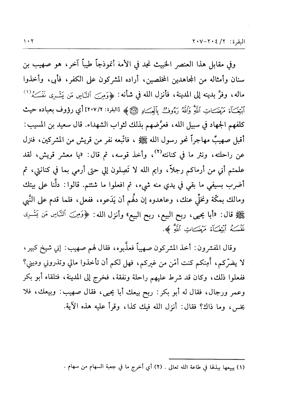 قال سعيد بن المسيب: أقبل صهيب مهاجرا نحو رسول الله صلّى الله عليه وسلم، فاتّبعه نفر من قريش من المشركين، فنزل عن راحلته، ونثر ما في كنانته «2» ، وأخذ قوسه، ثم قال: «يا معشر قريش، لقد علمتم أني من أرماكم رجلا، وايم الله لا تصلون إلي حتى أرمي بما في كنانتي، ثم أضرب بسيفي ما بقي في يدي منه شيء، ثم افعلوا ما شئتم. قالوا: دلّنا على بيتك ومالك بمكّة ونخلّي عنك، وعاهدوه إن دلّهم أن يدعوه، ففعل، فلما قدم على النّبي صلّى الله عليه وسلّم قال: «أبا يحيى، ربح البيع، ربح البيع» وأنزل الله: وَمِنَ النَّاسِ مَنْ يَشْرِي نَفْسَهُ ابْتِغاءَ مَرْضاتِ اللَّهِ.