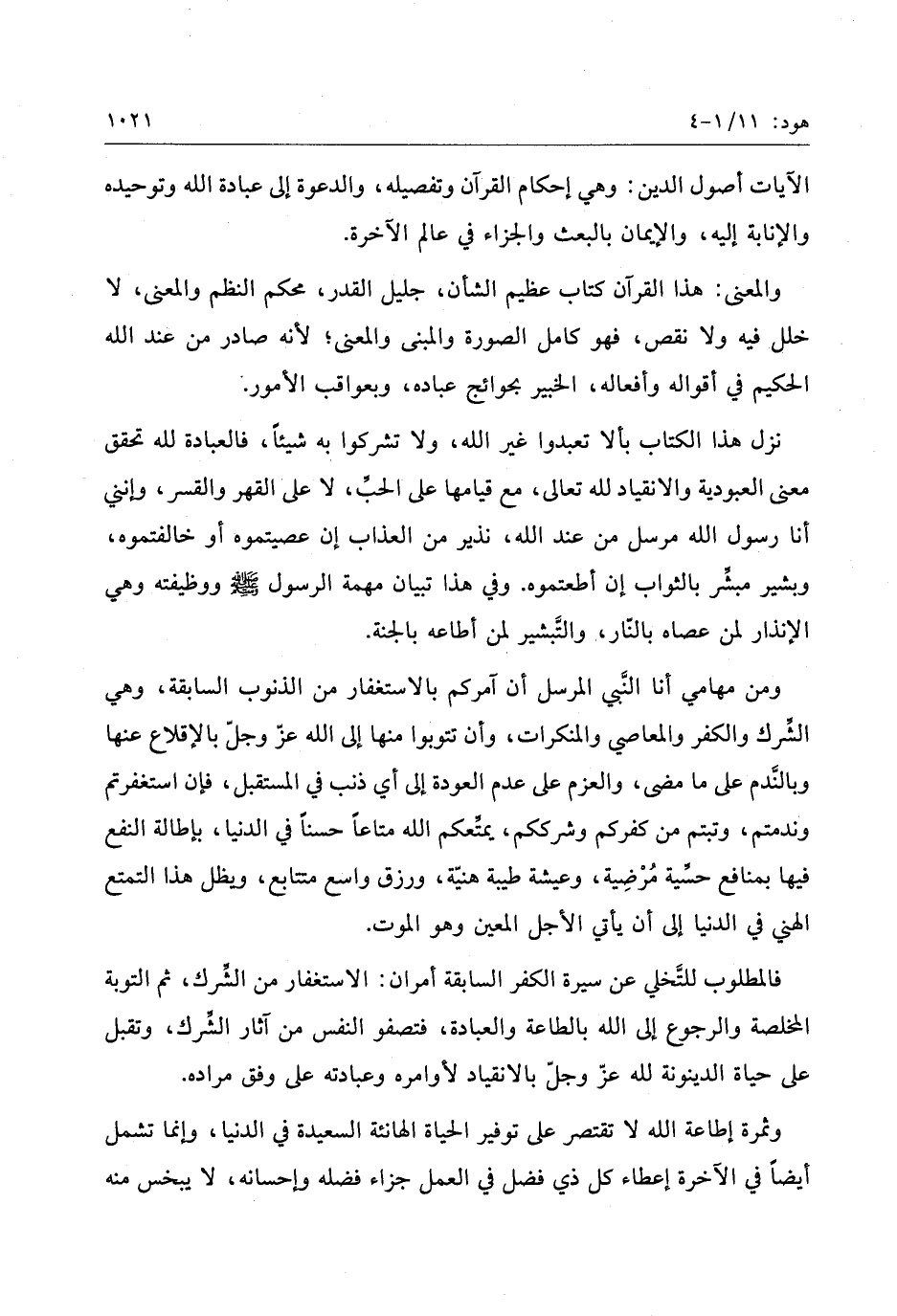 نزل هذا الكتاب بألا تعبدوا غير الله، ولا تشركوا به شيئا، فالعبادة لله تحقق معنى العبودية والانقياد لله تعالى، مع قيامها على الحبّ، لا على القهر والقسر، وإنني أنا رسول الله مرسل من عند الله، نذير من العذاب إن عصيتموه أو خالفتموه، وبشير مبشّر بالثواب إن أطعتموه. وفي هذا تبيان مهمة الرسول صلّى الله عليه وسلّم ووظيفته وهي الإنذار لمن عصاه بالنّار، والتّبشير لمن أطاعه بالجنة.