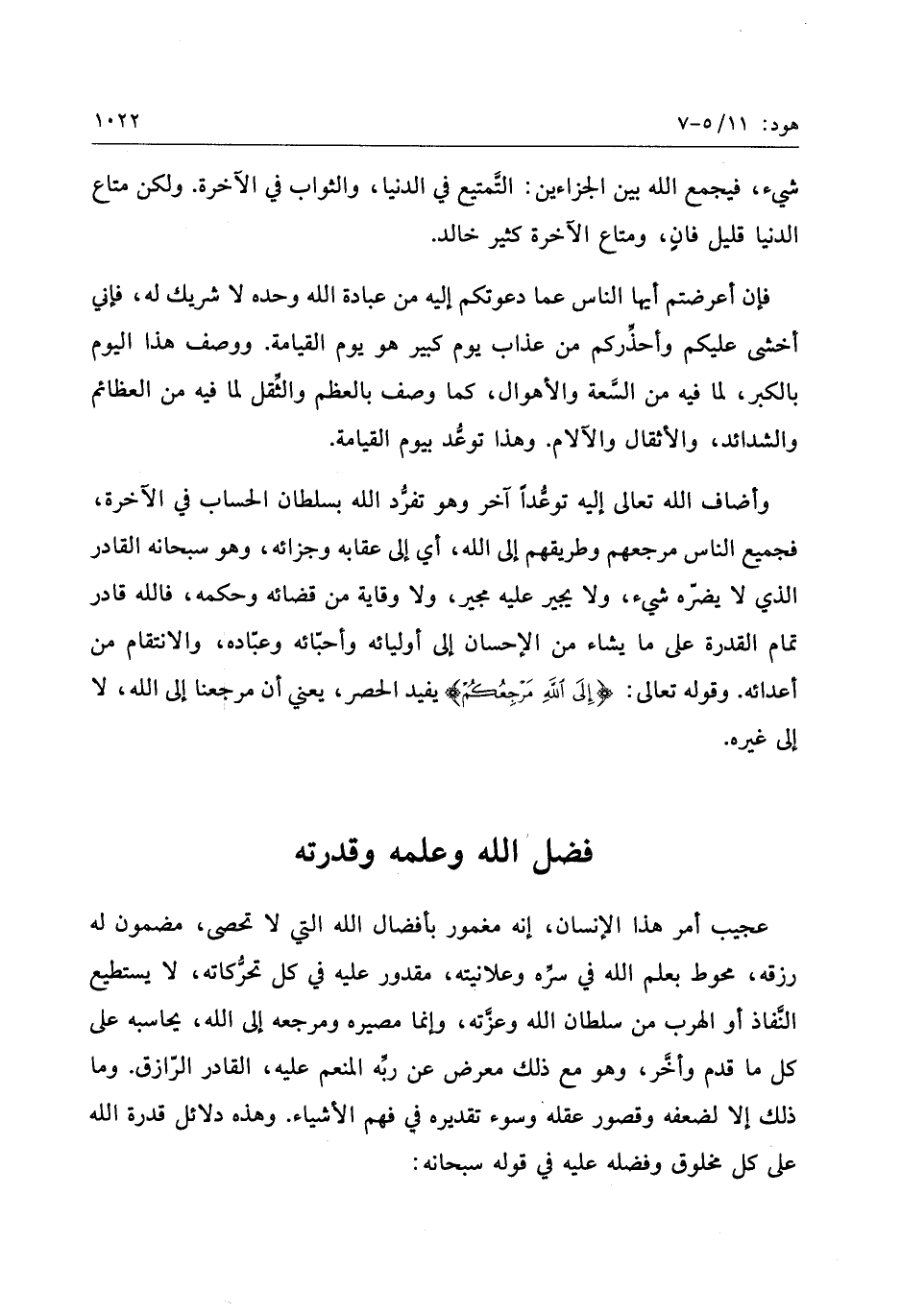 وأضاف الله تعالى إليه توعّدا آخر وهو تفرّد الله بسلطان الحساب في الآخرة، فجميع الناس مرجعهم وطريقهم إلى الله، أي إلى عقابه وجزائه، وهو سبحانه القادر الذي لا يضرّه شيء، ولا يجير عليه مجير، ولا وقاية من قضائه وحكمه، فالله قادر تمام القدرة على ما يشاء من الإحسان إلى أوليائه وأحبّائه وعبّاده، والانتقام من أعدائه. وقوله تعالى: إِلَى اللَّهِ مَرْجِعُكُمْ يفيد الحصر، يعني أن مرجعنا إلى الله، لا إلى غيره.