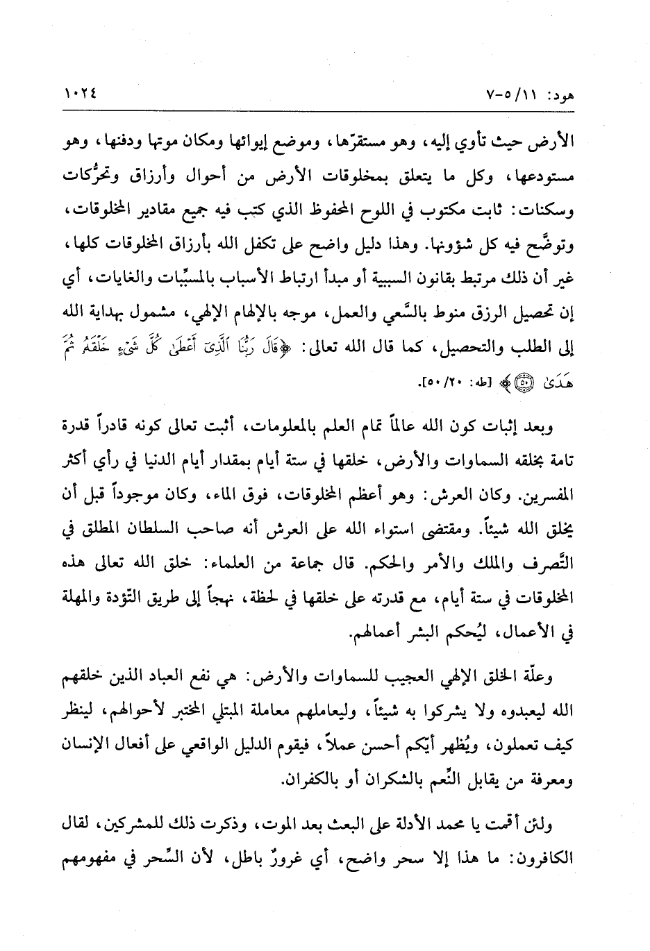 وبعد إثبات كون الله عالما تمام العلم بالمعلومات، أثبت تعالى كونه قادرا قدرة تامة بخلقه السماوات والأرض، خلقها في ستة أيام بمقدار أيام الدنيا في رأي أكثر المفسرين. وكان العرش: وهو أعظم المخلوقات، فوق الماء، وكان موجودا قبل أن يخلق الله شيئا. ومقتضى استواء الله على العرش أنه صاحب السلطان المطلق في التّصرف والملك والأمر والحكم. قال جماعة من العلماء: خلق الله تعالى هذه المخلوقات في ستة أيام، مع قدرته على خلقها في لحظة، نهجا إلى طريق التّؤدة والمهلة في الأعمال، ليحكم البشر أعمالهم.