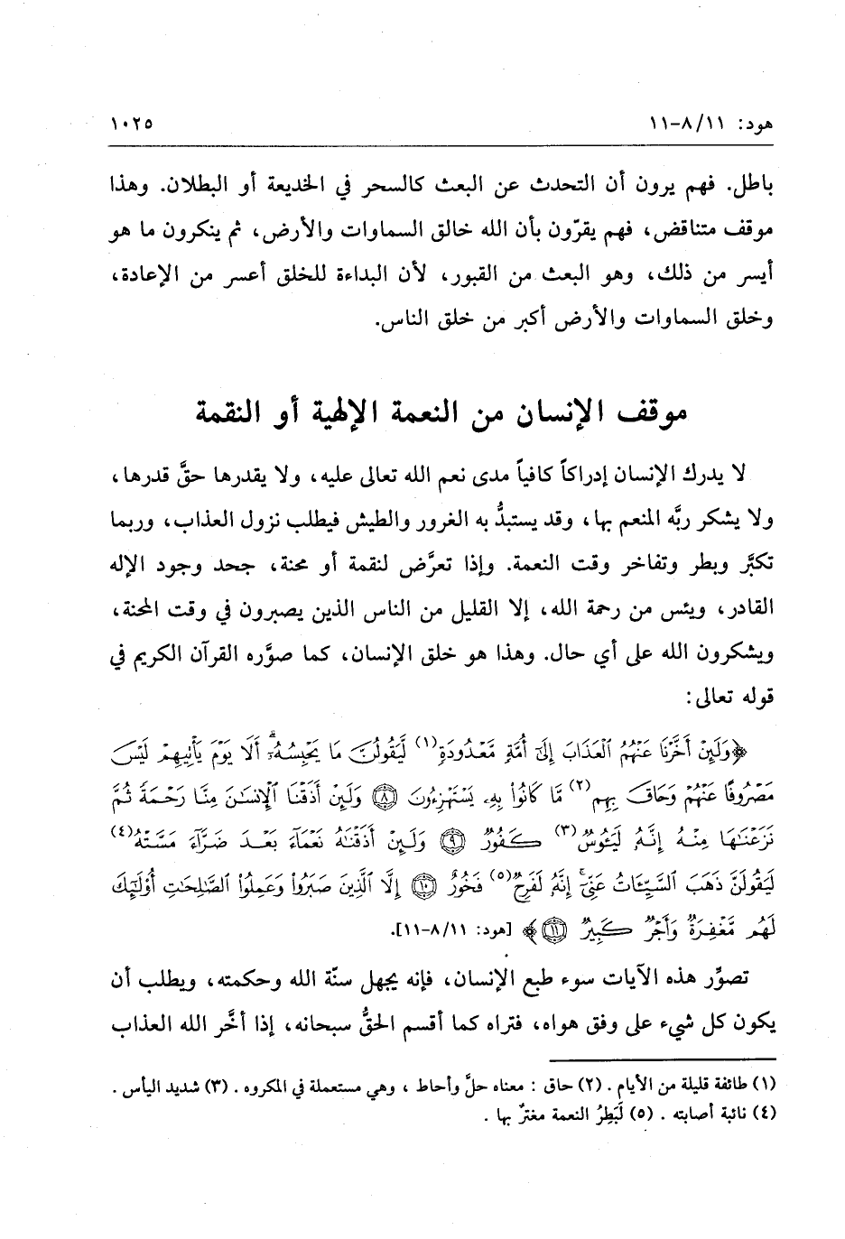 وَلَئِنْ أَخَّرْنا عَنْهُمُ الْعَذابَ إِلى أُمَّةٍ مَعْدُودَةٍ لَيَقُولُنَّ ما يَحْبِسُهُ أَلا يَوْمَ يَأْتِيهِمْ لَيْسَ مَصْرُوفاً عَنْهُمْ وَحاقَ بِهِمْ ما كانُوا بِهِ يَسْتَهْزِؤُنَ (8) وَلَئِنْ أَذَقْنَا الْإِنْسانَ مِنَّا رَحْمَةً ثُمَّ نَزَعْناها مِنْهُ إِنَّهُ لَيَؤُسٌ كَفُورٌ (9) وَلَئِنْ أَذَقْناهُ نَعْماءَ بَعْدَ ضَرَّاءَ مَسَّتْهُ لَيَقُولَنَّ ذَهَبَ السَّيِّئاتُ عَنِّي إِنَّهُ لَفَرِحٌ فَخُورٌ (10) إِلاَّ الَّذِينَ صَبَرُوا وَعَمِلُوا الصَّالِحاتِ أُولئِكَ لَهُمْ مَغْفِرَةٌ وَأَجْرٌ كَبِيرٌ (11)