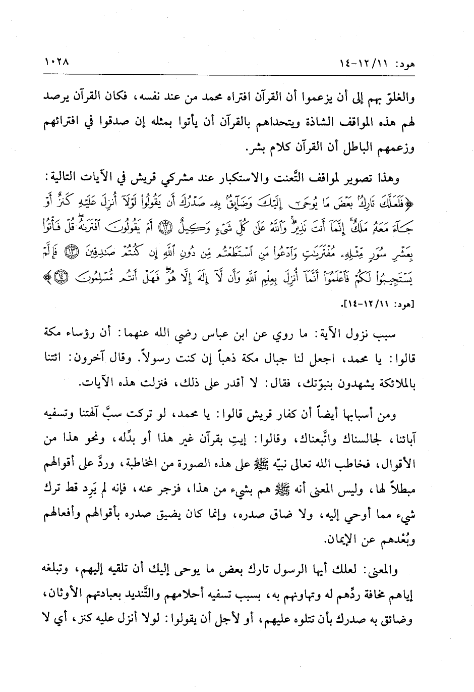 فَلَعَلَّكَ تارِكٌ بَعْضَ ما يُوحى إِلَيْكَ وَضائِقٌ بِهِ صَدْرُكَ أَنْ يَقُولُوا لَوْلا أُنْزِلَ عَلَيْهِ كَنْزٌ أَوْ جاءَ مَعَهُ مَلَكٌ إِنَّما أَنْتَ نَذِيرٌ وَاللَّهُ عَلى كُلِّ شَيْءٍ وَكِيلٌ (12) أَمْ يَقُولُونَ افْتَراهُ قُلْ فَأْتُوا بِعَشْرِ سُوَرٍ مِثْلِهِ مُفْتَرَياتٍ وَادْعُوا مَنِ اسْتَطَعْتُمْ مِنْ دُونِ اللَّهِ إِنْ كُنْتُمْ صادِقِينَ (13) فَإِلَّمْ يَسْتَجِيبُوا لَكُمْ فَاعْلَمُوا أَنَّما أُنْزِلَ بِعِلْمِ اللَّهِ وَأَنْ لا إِلهَ إِلاَّ هُوَ فَهَلْ أَنْتُمْ مُسْلِمُونَ (14)