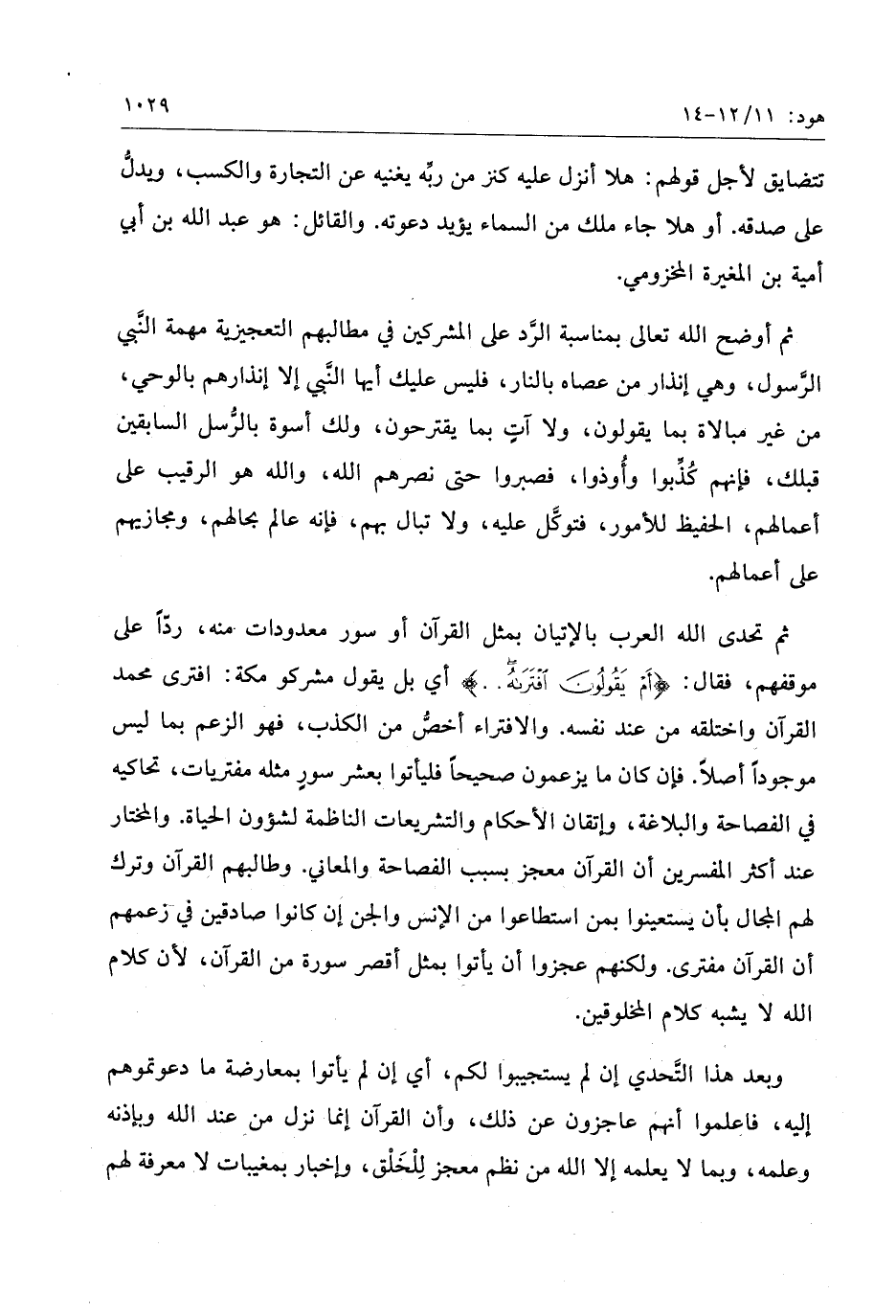 ثم تحدى الله العرب بالإتيان بمثل القرآن أو سور معدودات منه، ردّا على موقفهم، فقال: أَمْ يَقُولُونَ افْتَراهُ ... أي بل يقول مشركو مكة: افترى محمد القرآن واختلقه من عند نفسه. والافتراء أخصّ من الكذب، فهو الزعم بما ليس موجودا أصلا. فإن كان ما يزعمون صحيحا فليأتوا بعشر سور مثله مفتريات، تحاكيه في الفصاحة والبلاغة، وإتقان الأحكام والتشريعات الناظمة لشؤون الحياة. والمختار عند أكثر المفسرين أن القرآن معجز بسبب الفصاحة والمعاني. وطالبهم القرآن وترك لهم المجال بأن يستعينوا بمن استطاعوا من الإنس والجن إن كانوا صادقين في زعمهم أن القرآن مفترى. ولكنهم عجزوا أن يأتوا بمثل أقصر سورة من القرآن، لأن كلام الله لا يشبه كلام المخلوقين.