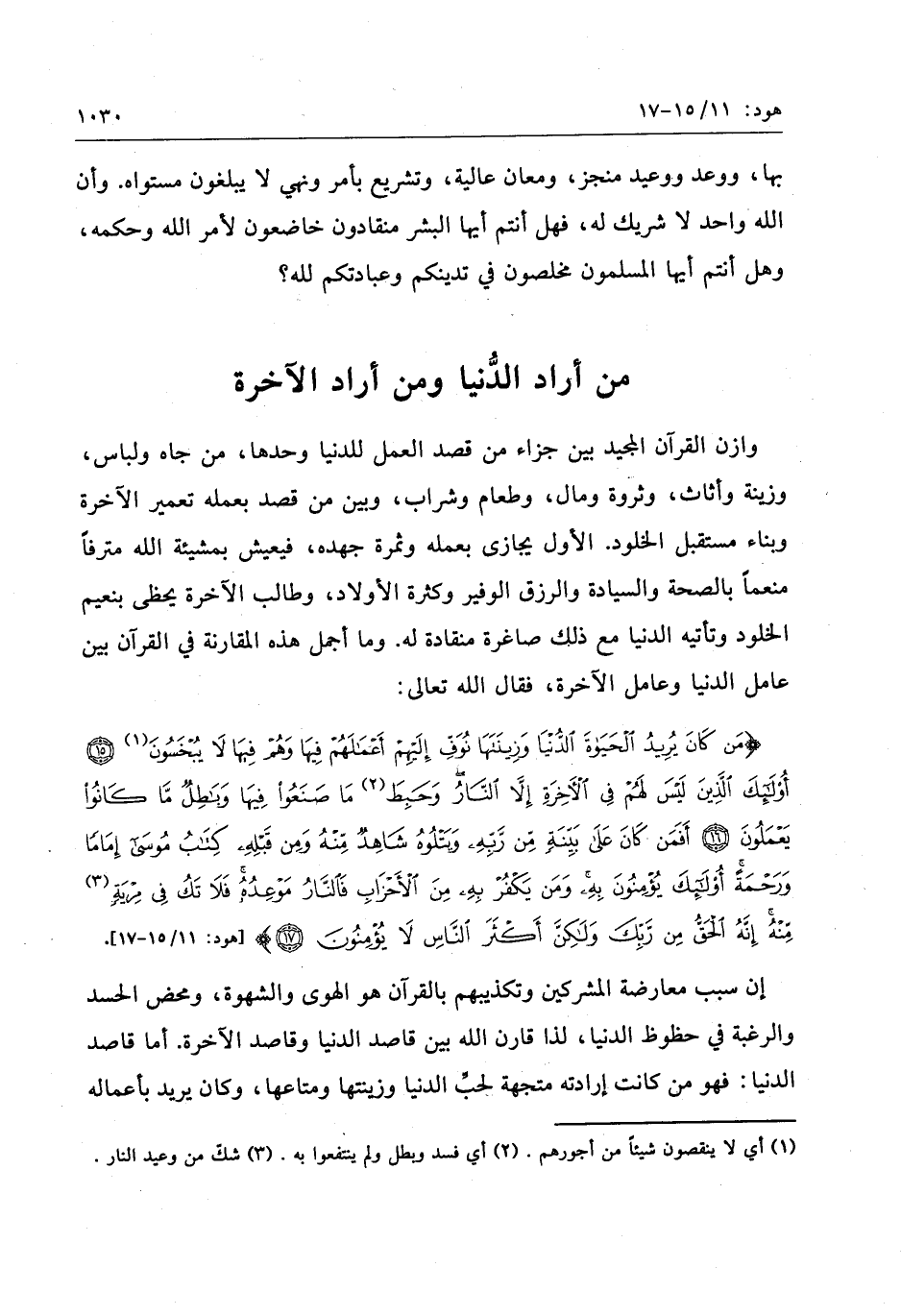 مَنْ كانَ يُرِيدُ الْحَياةَ الدُّنْيا وَزِينَتَها نُوَفِّ إِلَيْهِمْ أَعْمالَهُمْ فِيها وَهُمْ فِيها لا يُبْخَسُونَ (15) أُولئِكَ الَّذِينَ لَيْسَ لَهُمْ فِي الْآخِرَةِ إِلاَّ النَّارُ وَحَبِطَ ما صَنَعُوا فِيها وَباطِلٌ ما كانُوا يَعْمَلُونَ (16) أَفَمَنْ كانَ عَلى بَيِّنَةٍ مِنْ رَبِّهِ وَيَتْلُوهُ شاهِدٌ مِنْهُ وَمِنْ قَبْلِهِ كِتابُ مُوسى إِماماً وَرَحْمَةً أُولئِكَ يُؤْمِنُونَ بِهِ وَمَنْ يَكْفُرْ بِهِ مِنَ الْأَحْزابِ فَالنَّارُ مَوْعِدُهُ فَلا تَكُ فِي مِرْيَةٍ مِنْهُ إِنَّهُ الْحَقُّ مِنْ رَبِّكَ وَلكِنَّ أَكْثَرَ النَّاسِ لا يُؤْمِنُونَ (17)