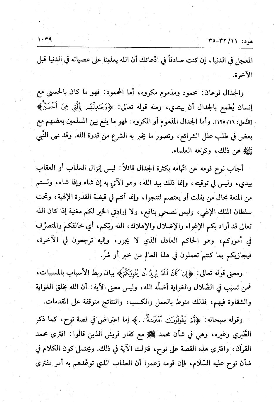 أجاب نوح قومه عن اتّهامه بكثرة الجدال قائلا: ليس إنزال العذاب أو العقاب بيدي، وليس لي توقيته، وإنما ذلك بيد الله، وهو الآتي به إن شاء وإذا شاء، ولستم من المنعة بحال من يفلت أو يعتصم لتنجوا، وإنما أنتم في قبضة القدرة الإلهية، وتحت سلطان الملك الإلهي، وليس نصحي بنافع، ولا إرادتي الخير لكم مغنية إذا كان الله تعالى قد أراد بكم الإغواء والإضلال والإهلاك، الله ربّكم، أي خالقكم والمتصرّف في أموركم، وهو الحاكم العادل الذي لا يجور، وإليه ترجعون في الآخرة، فيجازيكم بما كنتم تعملون في هذا العالم من خير أو شرّ.