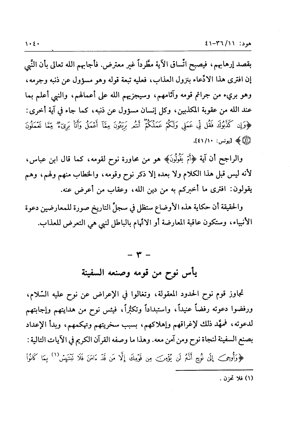 وَأُوحِيَ إِلى نُوحٍ أَنَّهُ لَنْ يُؤْمِنَ مِنْ قَوْمِكَ إِلاَّ مَنْ قَدْ آمَنَ فَلا تَبْتَئِسْ بِما كانُوا يَفْعَلُونَ (36) وَاصْنَعِ الْفُلْكَ بِأَعْيُنِنا وَوَحْيِنا وَلا تُخاطِبْنِي فِي الَّذِينَ ظَلَمُوا إِنَّهُمْ مُغْرَقُونَ (37) وَيَصْنَعُ الْفُلْكَ وَكُلَّما مَرَّ عَلَيْهِ مَلَأٌ مِنْ قَوْمِهِ سَخِرُوا مِنْهُ قالَ إِنْ تَسْخَرُوا مِنَّا فَإِنَّا نَسْخَرُ مِنْكُمْ كَما تَسْخَرُونَ (38) فَسَوْفَ تَعْلَمُونَ مَنْ يَأْتِيهِ عَذابٌ يُخْزِيهِ وَيَحِلُّ عَلَيْهِ عَذابٌ مُقِيمٌ (39) حَتَّى إِذا جاءَ أَمْرُنا وَفارَ التَّنُّورُ قُلْنَا احْمِلْ فِيها مِنْ كُلٍّ زَوْجَيْنِ اثْنَيْنِ وَأَهْلَكَ إِلاَّ مَنْ سَبَقَ عَلَيْهِ الْقَوْلُ وَمَنْ آمَنَ وَما آمَنَ مَعَهُ إِلاَّ قَلِيلٌ (40)