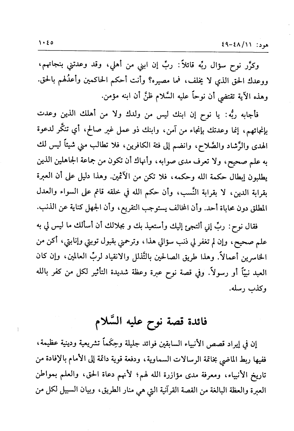 فقال نوح: ربّ إني ألتجئ إليك وأستعيذ بك وبجلالك أن أسألك ما ليس لي به علم صحيح، وإن لم تغفر لي ذنب سؤالي هذا، وترحمني بقبول توبتي وإنابتي، أكن من الخاسرين أعمالا. وهذا طريق الصالحين بالتّذلل والانقياد لربّ العالمين، وإن كان العبد نبيّا أو رسولا. وفي قصة نوح عبرة وعظة شديدة التأثير لكل من كفر بالله وكذب رسله.