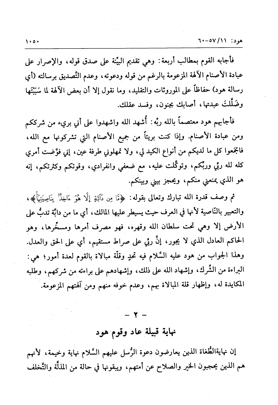 فأجابهم هود معتصما بالله ربّه: أشهد الله واشهدوا على أني بريء من شرككم ومن عبادة الأصنام. وإذا كنت بريئا من جميع الأصنام التي تشركونها مع الله، فاجمعوا كل ما لديكم من أنواع الكيد لي، ولا تمهلوني طرفة عين، إني فوّضت أمري كله لله ربّي وربّكم، وتوكّلت عليه، مع ضعفي وانفرادي، وقوتكم وكثرتكم، إنه هو الذي يمنعني منكم، ويحجز بيني وبينكم.