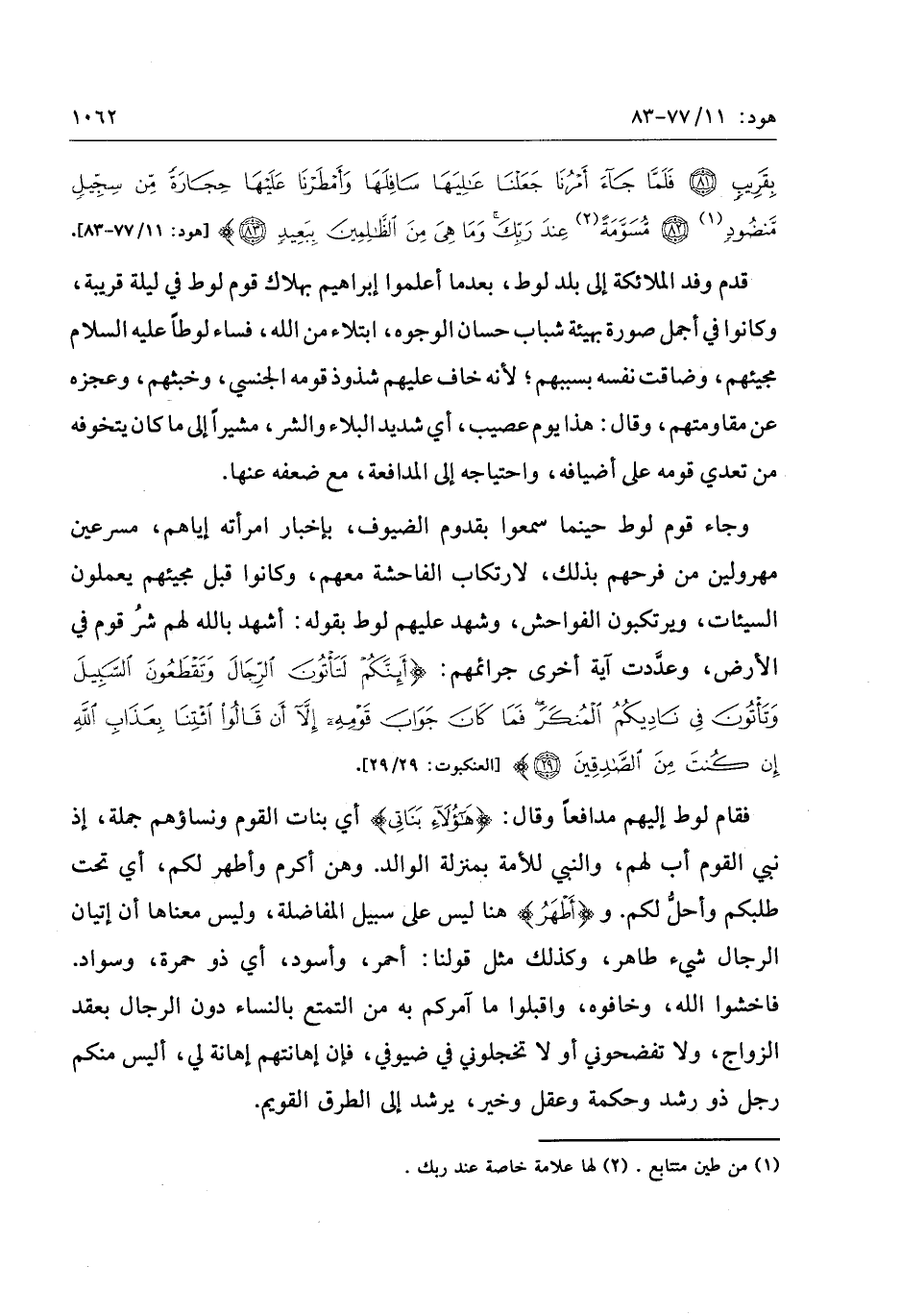 فقام لوط إليهم مدافعا وقال: هؤُلاءِ بَناتِي أي بنات القوم ونساؤهم جملة، إذ نبي القوم أب لهم، والنبي للأمة بمنزلة الوالد. وهن أكرم وأطهر لكم، أي تحت طلبكم وأحلّ لكم. وأَطْهَرُ هنا ليس على سبيل المفاضلة، وليس معناها أن إتيان الرجال شيء طاهر، وكذلك مثل قولنا: أحمر، وأسود، أي ذو حمرة، وسواد.