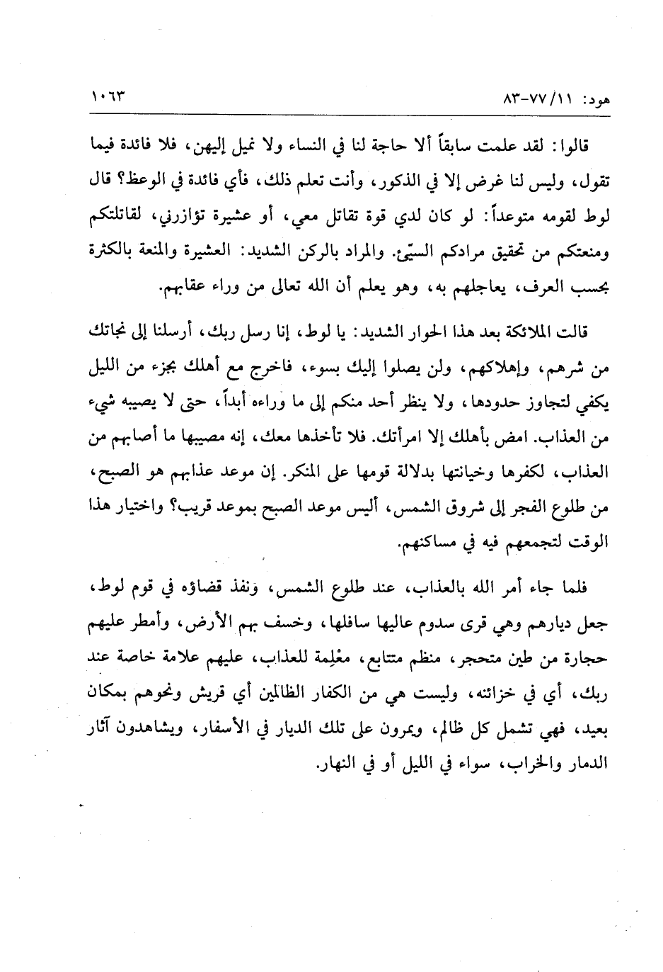 قالت الملائكة بعد هذا الحوار الشديد: يا لوط، إنا رسل ربك، أرسلنا إلى نجاتك من شرهم، وإهلاكهم، ولن يصلوا إليك بسوء، فاخرج مع أهلك بجزء من الليل يكفي لتجاوز حدودها، ولا ينظر أحد منكم إلى ما وراءه أبدا، حتى لا يصيبه شيء من العذاب. امض بأهلك إلا امرأتك. فلا تأخذها معك، إنه مصيبها ما أصابهم من العذاب، لكفرها وخيانتها بدلالة قومها على المنكر. إن موعد عذابهم هو الصبح، من طلوع الفجر إلى شروق الشمس، أليس موعد الصبح بموعد قريب؟ واختيار هذا الوقت لتجمعهم فيه في مساكنهم.