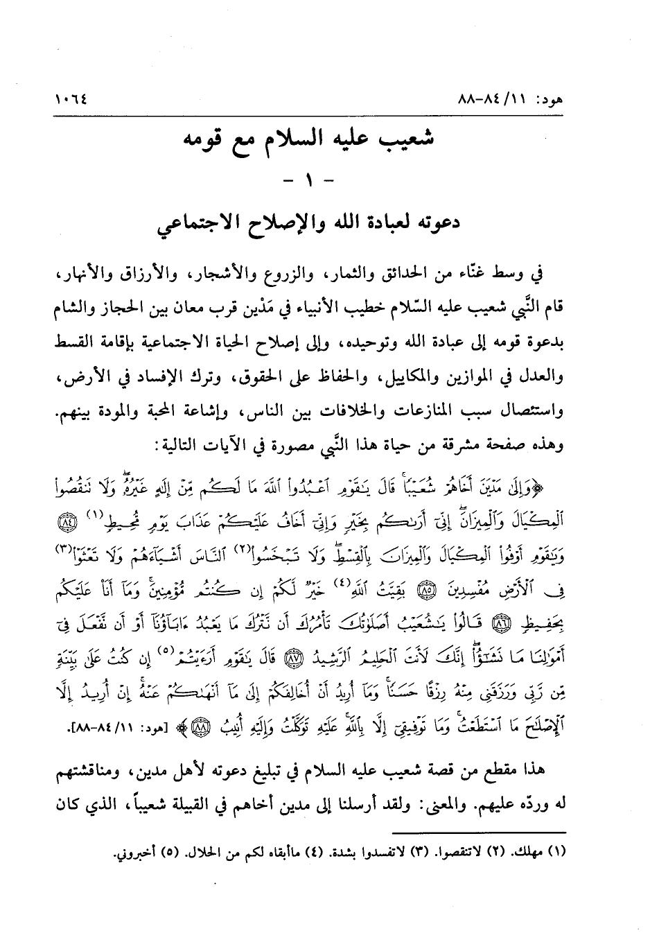 وَإِلى مَدْيَنَ أَخاهُمْ شُعَيْباً قالَ يا قَوْمِ اعْبُدُوا اللَّهَ ما لَكُمْ مِنْ إِلهٍ غَيْرُهُ وَلا تَنْقُصُوا الْمِكْيالَ وَالْمِيزانَ إِنِّي أَراكُمْ بِخَيْرٍ وَإِنِّي أَخافُ عَلَيْكُمْ عَذابَ يَوْمٍ مُحِيطٍ (84) وَيا قَوْمِ أَوْفُوا الْمِكْيالَ وَالْمِيزانَ بِالْقِسْطِ وَلا تَبْخَسُوا النَّاسَ أَشْياءَهُمْ وَلا تَعْثَوْا فِي الْأَرْضِ مُفْسِدِينَ (85) بَقِيَّتُ اللَّهِ خَيْرٌ لَكُمْ إِنْ كُنْتُمْ مُؤْمِنِينَ وَما أَنَا عَلَيْكُمْ بِحَفِيظٍ (86) قالُوا يا شُعَيْبُ أَصَلاتُكَ تَأْمُرُكَ أَنْ نَتْرُكَ ما يَعْبُدُ آباؤُنا أَوْ أَنْ نَفْعَلَ فِي أَمْوالِنا ما نَشؤُا إِنَّكَ لَأَنْتَ الْحَلِيمُ الرَّشِيدُ (87) قالَ يا قَوْمِ أَرَأَيْتُمْ إِنْ كُنْتُ عَلى بَيِّنَةٍ مِنْ رَبِّي وَرَزَقَنِي مِنْهُ رِزْقاً حَسَناً وَما أُرِيدُ أَنْ أُخالِفَكُمْ إِلى ما أَنْهاكُمْ عَنْهُ إِنْ أُرِيدُ إِلاَّ الْإِصْلاحَ مَا اسْتَطَعْتُ وَما تَوْفِيقِي إِلاَّ بِاللَّهِ عَلَيْهِ تَوَكَّلْتُ وَإِلَيْهِ أُنِيبُ (88)