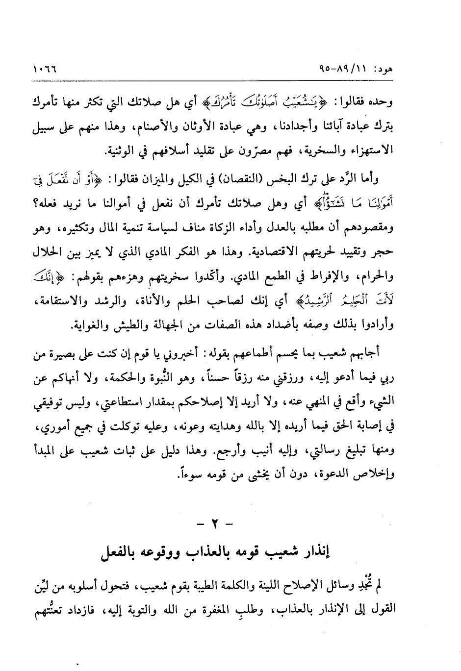 أجابهم شعيب بما يحسم أطماعهم بقوله: أخبروني يا قوم إن كنت على بصيرة من ربي فيما أدعو إليه، ورزقني منه رزقا حسنا، وهو النّبوة والحكمة، ولا أنهاكم عن الشيء وأقع في المنهي عنه، ولا أريد إلا إصلاحكم بمقدار استطاعتي، وليس توفيقي في إصابة الحق فيما أريده إلا بالله وهدايته وعونه، وعليه توكلت في جميع أموري، ومنها تبليغ رسالتي، وإليه أنيب وأرجع. وهذا دليل على ثبات شعيب على المبدأ وإخلاص الدعوة، دون أن يخشى من قومه سوءا.