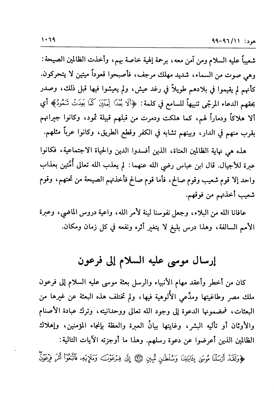 وَلَقَدْ أَرْسَلْنا مُوسى بِآياتِنا وَسُلْطانٍ مُبِينٍ (96) إِلى فِرْعَوْنَ وَمَلائِهِ فَاتَّبَعُوا أَمْرَ فِرْعَوْنَ وَما أَمْرُ فِرْعَوْنَ بِرَشِيدٍ (97) يَقْدُمُ قَوْمَهُ يَوْمَ الْقِيامَةِ فَأَوْرَدَهُمُ النَّارَ وَبِئْسَ الْوِرْدُ الْمَوْرُودُ (98) وَأُتْبِعُوا فِي هذِهِ لَعْنَةً وَيَوْمَ الْقِيامَةِ بِئْسَ الرِّفْدُ الْمَرْفُودُ (99)