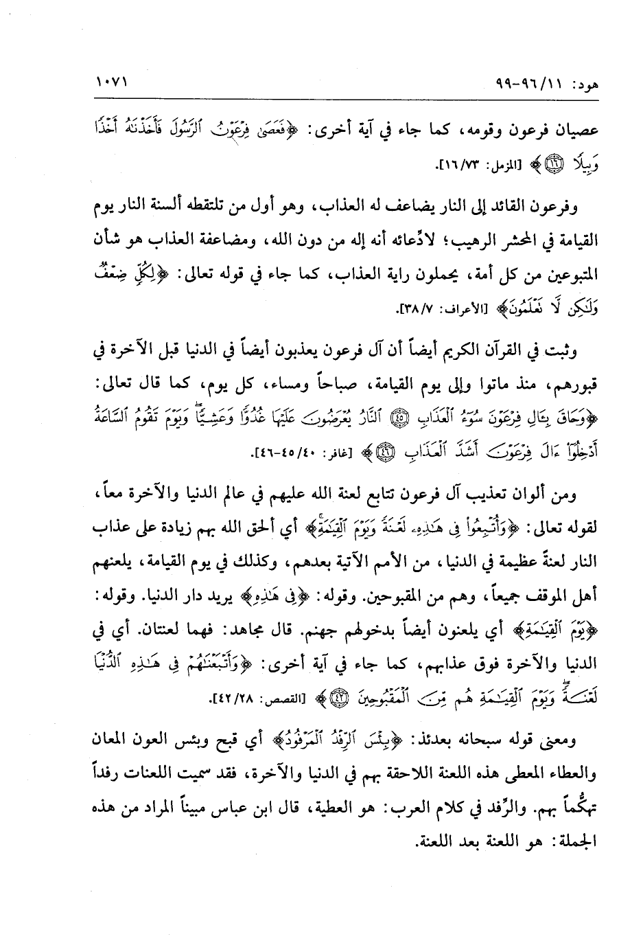 وفرعون القائد إلى النار يضاعف له العذاب، وهو أول من تلتقطه ألسنة النار يوم القيامة في المحشر الرهيب لادّعائه أنه إله من دون الله، ومضاعفة العذاب هو شأن المتبوعين من كل أمة، يحملون راية العذاب، كما جاء في قوله تعالى: لِكُلٍّ ضِعْفٌ وَلكِنْ لا تَعْلَمُونَ [الأعراف: 7/ 38] .
