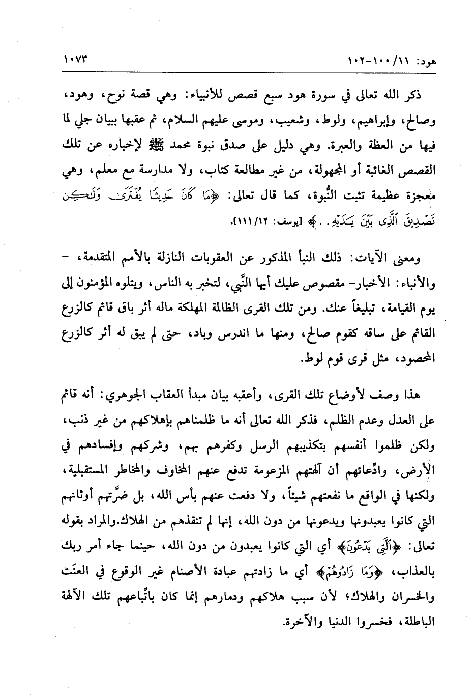 ومعنى الآيات: ذلك النبأ المذكور عن العقوبات النازلة بالأمم المتقدمة،- والأنباء: الأخبار- مقصوص عليك أيها النّبي، لتخبر به الناس، ويتلوه المؤمنون إلى يوم القيامة، تبليغا عنك. ومن تلك القرى الظالمة المهلكة ماله أثر باق قائم كالزرع القائم على ساقه كقوم صالح، ومنها ما اندرس وباد، حتى لم يبق له أثر كالزرع المحصود، مثل قرى قوم لوط.
