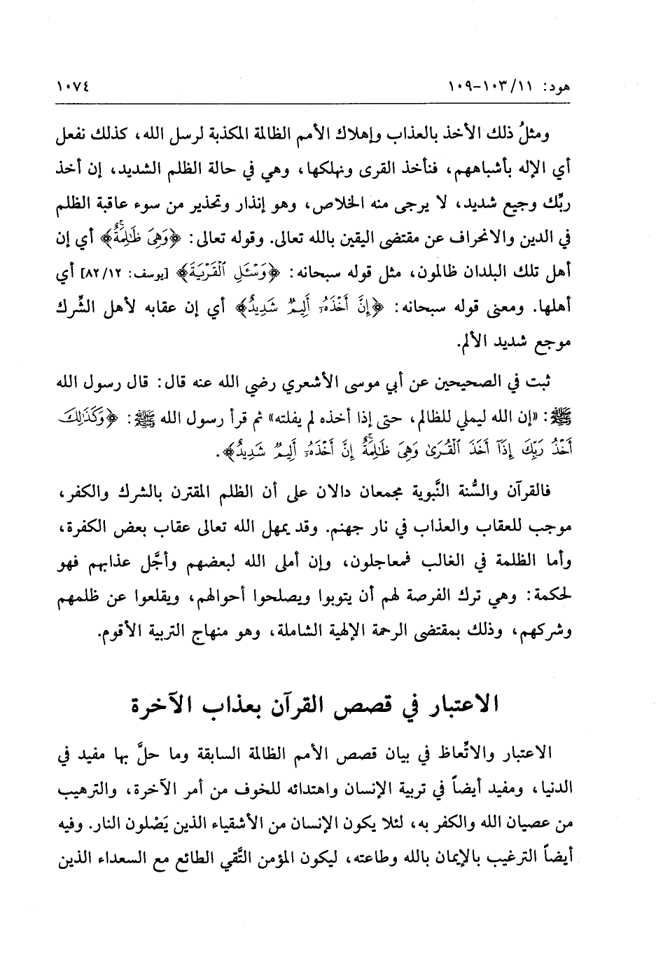 الاعتبار والاتّعاظ في بيان قصص الأمم الظالمة السابقة وما حلّ بها مفيد في الدنيا، ومفيد أيضا في تربية الإنسان واهتدائه للخوف من أمر الآخرة، والترهيب من عصيان الله والكفر به، لئلا يكون الإنسان من الأشقياء الذين يصلون النار. وفيه أيضا الترغيب بالإيمان بالله وطاعته، ليكون المؤمن التّقي الطائع مع السعداء الذين