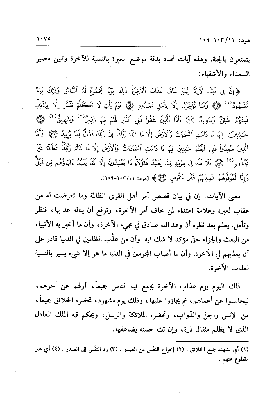 إِنَّ فِي ذلِكَ لَآيَةً لِمَنْ خافَ عَذابَ الْآخِرَةِ ذلِكَ يَوْمٌ مَجْمُوعٌ لَهُ النَّاسُ وَذلِكَ يَوْمٌ مَشْهُودٌ (103) وَما نُؤَخِّرُهُ إِلاَّ لِأَجَلٍ مَعْدُودٍ (104) يَوْمَ يَأْتِ لا تَكَلَّمُ نَفْسٌ إِلاَّ بِإِذْنِهِ فَمِنْهُمْ شَقِيٌّ وَسَعِيدٌ (105) فَأَمَّا الَّذِينَ شَقُوا فَفِي النَّارِ لَهُمْ فِيها زَفِيرٌ وَشَهِيقٌ (106) خالِدِينَ فِيها ما دامَتِ السَّماواتُ وَالْأَرْضُ إِلاَّ ما شاءَ رَبُّكَ إِنَّ رَبَّكَ فَعَّالٌ لِما يُرِيدُ (107)