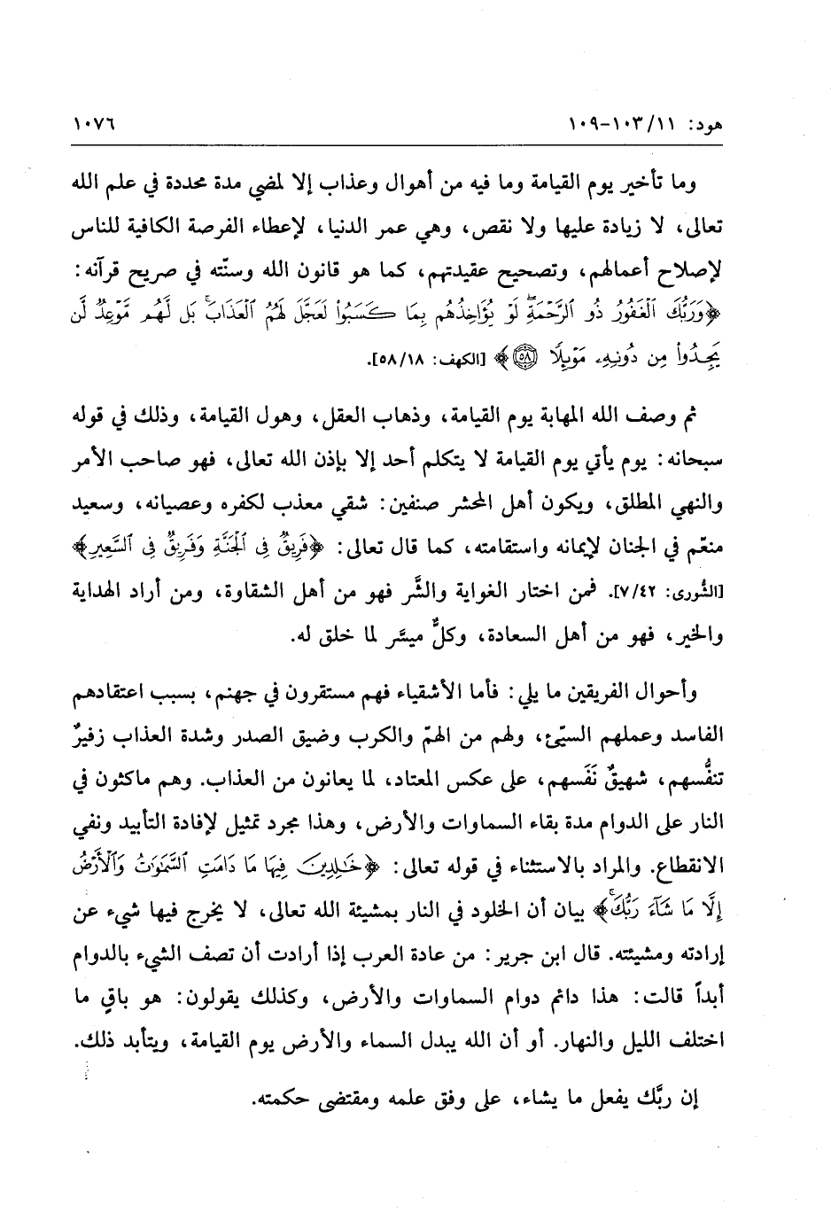 وأحوال الفريقين ما يلي: فأما الأشقياء فهم مستقرون في جهنم، بسبب اعتقادهم الفاسد وعملهم السيّئ، ولهم من الهمّ والكرب وضيق الصدر وشدة العذاب زفير تنفّسهم، شهيق نفسهم، على عكس المعتاد، لما يعانون من العذاب. وهم ماكثون في النار على الدوام مدة بقاء السماوات والأرض، وهذا مجرد تمثيل لإفادة التأبيد ونفي الانقطاع. والمراد بالاستثناء في قوله تعالى: خالِدِينَ فِيها ما دامَتِ السَّماواتُ وَالْأَرْضُ إِلَّا ما شاءَ رَبُّكَ بيان أن الخلود في النار بمشيئة الله تعالى، لا يخرج فيها شيء عن إرادته ومشيئته. قال ابن جرير: من عادة العرب إذا أرادت أن تصف الشيء بالدوام أبدا قالت: هذا دائم دوام السماوات والأرض، وكذلك يقولون: هو باق ما اختلف الليل والنهار. أو أن الله يبدل السماء والأرض يوم القيامة، ويتأبد ذلك.