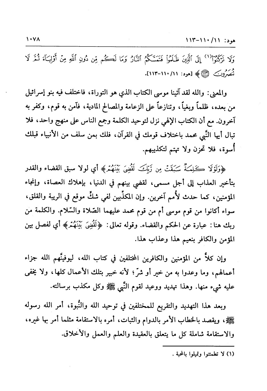 وَلَوْلا كَلِمَةٌ سَبَقَتْ مِنْ رَبِّكَ لَقُضِيَ بَيْنَهُمْ أي لولا سبق القضاء والقدر بتأخير العذاب إلى أجل مسمى، لقضي بينهم في الدنيا، بإهلاك العصاة، وإنجاء المؤمنين، كما حدث لأم آخرين. وإن المكذّبين لفي شكّ موقع في الريبة والقلق، سواء أكانوا من قوم موسى أم من قوم محمد عليهما الصّلاة والسّلام. والكلمة من ربك هنا: عبارة عن الحكم والقضاء. وقوله تعالى: لَقُضِيَ بَيْنَهُمْ أي لفصل بين المؤمن والكافر بنعيم هذا وعذاب هذا.