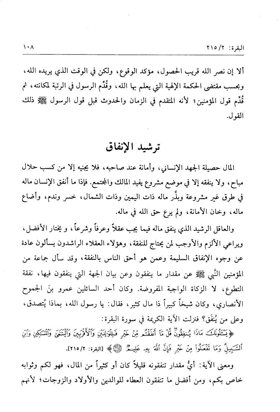 يَسْئَلُونَكَ ماذا يُنْفِقُونَ قُلْ ما أَنْفَقْتُمْ مِنْ خَيْرٍ فَلِلْوالِدَيْنِ وَالْأَقْرَبِينَ وَالْيَتامى وَالْمَساكِينِ وَابْنِ السَّبِيلِ وَما تَفْعَلُوا مِنْ خَيْرٍ فَإِنَّ اللَّهَ بِهِ عَلِيمٌ (215)