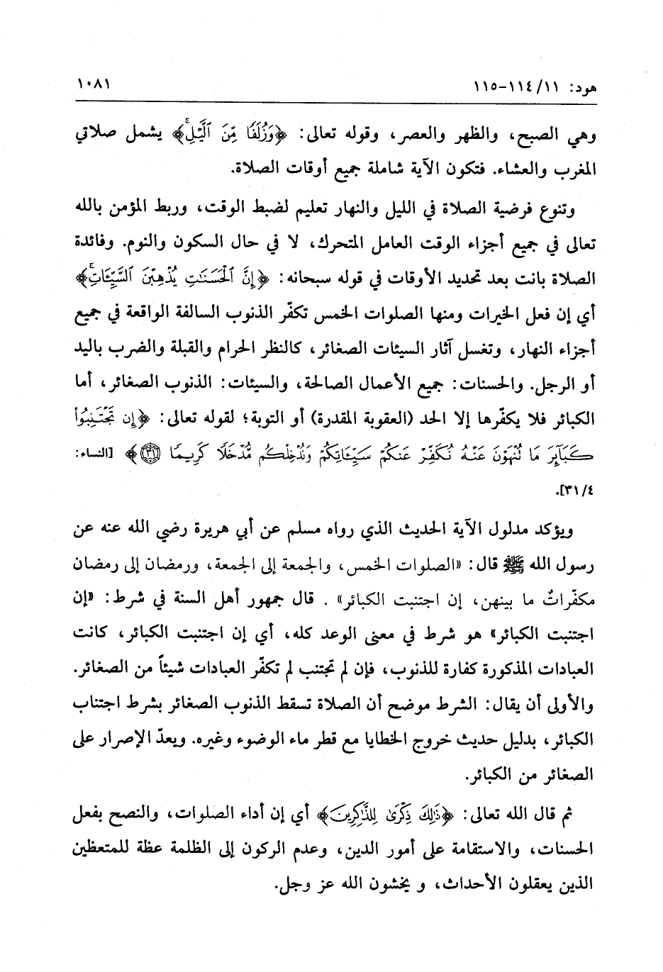 وتنوع فرضية الصلاة في الليل والنهار تعليم لضبط الوقت، وربط المؤمن بالله تعالى في جميع أجزاء الوقت العامل المتحرك، لا في حال السكون والنوم. وفائدة الصلاة بانت بعد تحديد الأوقات في قوله سبحانه: إِنَّ الْحَسَناتِ يُذْهِبْنَ السَّيِّئاتِ أي إن فعل الخيرات ومنها الصلوات الخمس تكفّر الذنوب السالفة الواقعة في جميع أجزاء النهار، وتغسل آثار السيئات الصغائر، كالنظر الحرام والقبلة والضرب باليد أو الرجل. والحسنات: جميع الأعمال الصالحة، والسيئات: الذنوب الصغائر، أما الكبائر فلا يكفّرها إلا الحد (العقوبة المقدرة) أو التوبة لقوله تعالى: إِنْ تَجْتَنِبُوا كَبائِرَ ما تُنْهَوْنَ عَنْهُ نُكَفِّرْ عَنْكُمْ سَيِّئاتِكُمْ وَنُدْخِلْكُمْ مُدْخَلًا كَرِيماً (31) [النساء: