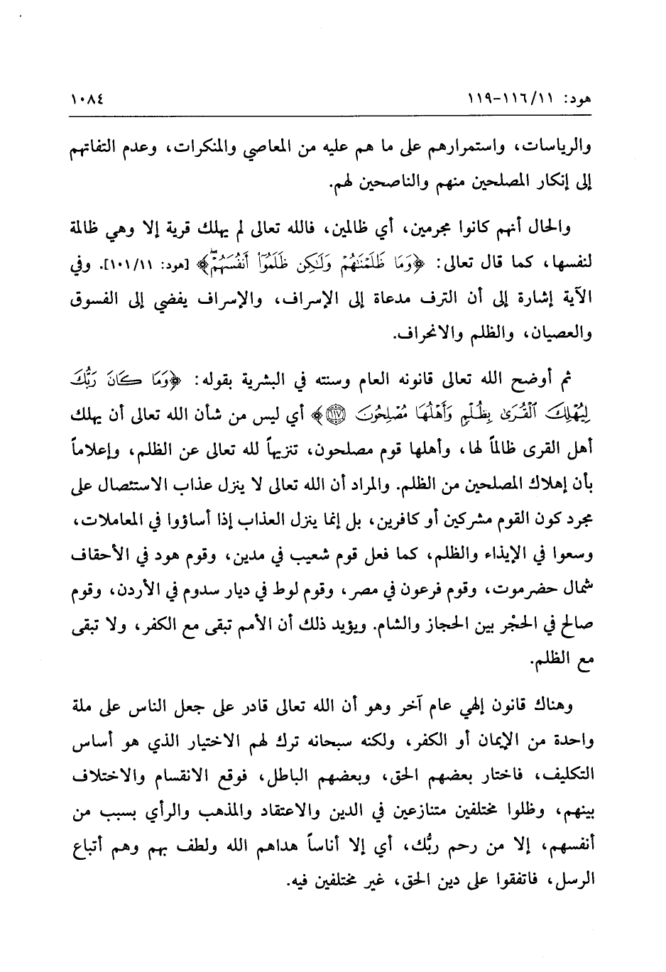 ثم أوضح الله تعالى قانونه العام وسنته في البشرية بقوله: وَما كانَ رَبُّكَ لِيُهْلِكَ الْقُرى بِظُلْمٍ وَأَهْلُها مُصْلِحُونَ (117) أي ليس من شأن الله تعالى أن يهلك أهل القرى ظالما لها، وأهلها قوم مصلحون، تنزيها لله تعالى عن الظلم، وإعلاما بأن إهلاك المصلحين من الظلم. والمراد أن الله تعالى لا ينزل عذاب الاستئصال على مجرد كون القوم مشركين أو كافرين، بل إنما ينزل العذاب إذا أساؤوا في المعاملات، وسعوا في الإيذاء والظلم، كما فعل قوم شعيب في مدين، وقوم هود في الأحقاف شمال حضرموت، وقوم فرعون في مصر، وقوم لوط في ديار سدوم في الأردن، وقوم صالح في الحجر بين الحجاز والشام. ويؤيد ذلك أن الأمم تبقى مع الكفر، ولا تبقى مع الظلم.