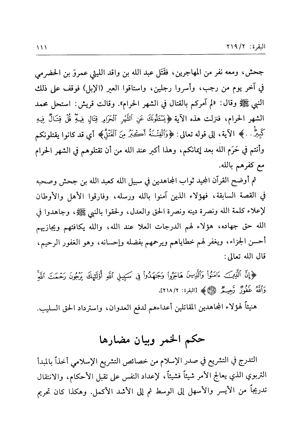 جحش، ومعه نفر من المهاجرين، فقتل عبد الله بن واقد الليثي عمرو بن الحضرمي في آخر يوم من رجب، وأسروا رجلين، واستاقوا العير (الإبل) فوقف على ذلك النبي صلّى الله عليه وسلّم وقال: «لم آمركم بالقتال في الشهر الحرام» . وقالت قريش: استحل محمد الشهر الحرام، فنزلت هذه الآية يَسْئَلُونَكَ عَنِ الشَّهْرِ الْحَرامِ قِتالٍ فِيهِ قُلْ قِتالٌ فِيهِ كَبِيرٌ ... الآية، إلى قوله تعالى: وَالْفِتْنَةُ أَكْبَرُ مِنَ الْقَتْلِ