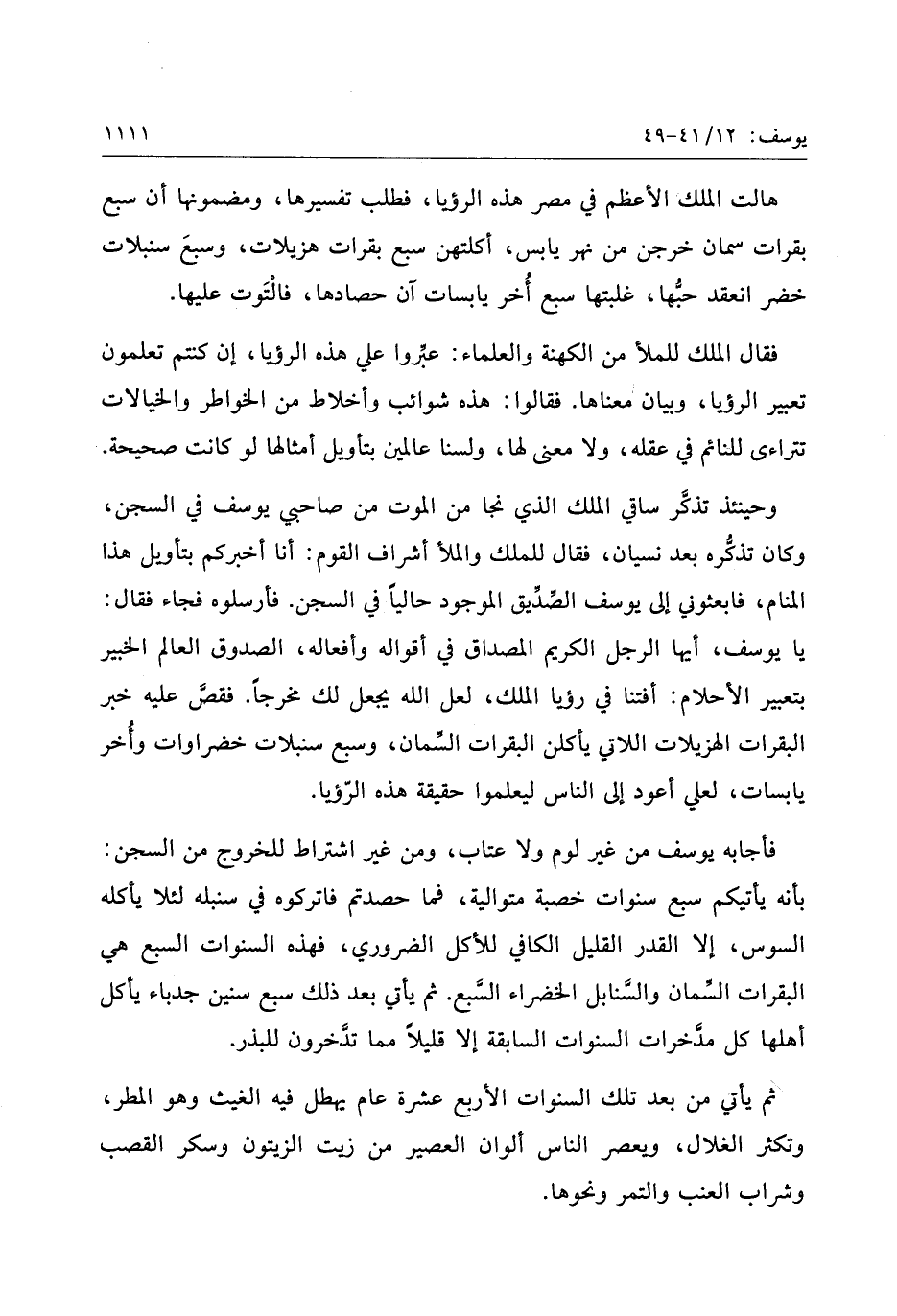 يا يوسف، أيها الرجل الكريم المصداق في أقواله وأفعاله، الصدوق العالم الخبير بتعبير الأحلام: أفتنا في رؤيا الملك، لعل الله يجعل لك مخرجا. فقصّ عليه خبر البقرات الهزيلات اللاتي يأكلن البقرات السّمان، وسبع سنبلات خضراوات وأخر يابسات، لعلي أعود إلى الناس ليعلموا حقيقة هذه الرّؤيا.