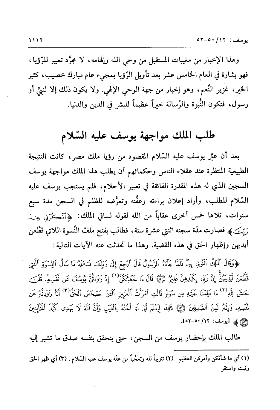 وَقالَ الْمَلِكُ ائْتُونِي بِهِ فَلَمَّا جاءَهُ الرَّسُولُ قالَ ارْجِعْ إِلى رَبِّكَ فَسْئَلْهُ ما بالُ النِّسْوَةِ اللاَّتِي قَطَّعْنَ أَيْدِيَهُنَّ إِنَّ رَبِّي بِكَيْدِهِنَّ عَلِيمٌ (50) قالَ ما خَطْبُكُنَّ إِذْ راوَدْتُنَّ يُوسُفَ عَنْ نَفْسِهِ قُلْنَ حاشَ لِلَّهِ ما عَلِمْنا عَلَيْهِ مِنْ سُوءٍ قالَتِ امْرَأَةُ الْعَزِيزِ الْآنَ حَصْحَصَ الْحَقُّ أَنَا راوَدْتُهُ عَنْ نَفْسِهِ وَإِنَّهُ لَمِنَ الصَّادِقِينَ (51) ذلِكَ لِيَعْلَمَ أَنِّي لَمْ أَخُنْهُ بِالْغَيْبِ وَأَنَّ اللَّهَ لا يَهْدِي كَيْدَ الْخائِنِينَ (52)
