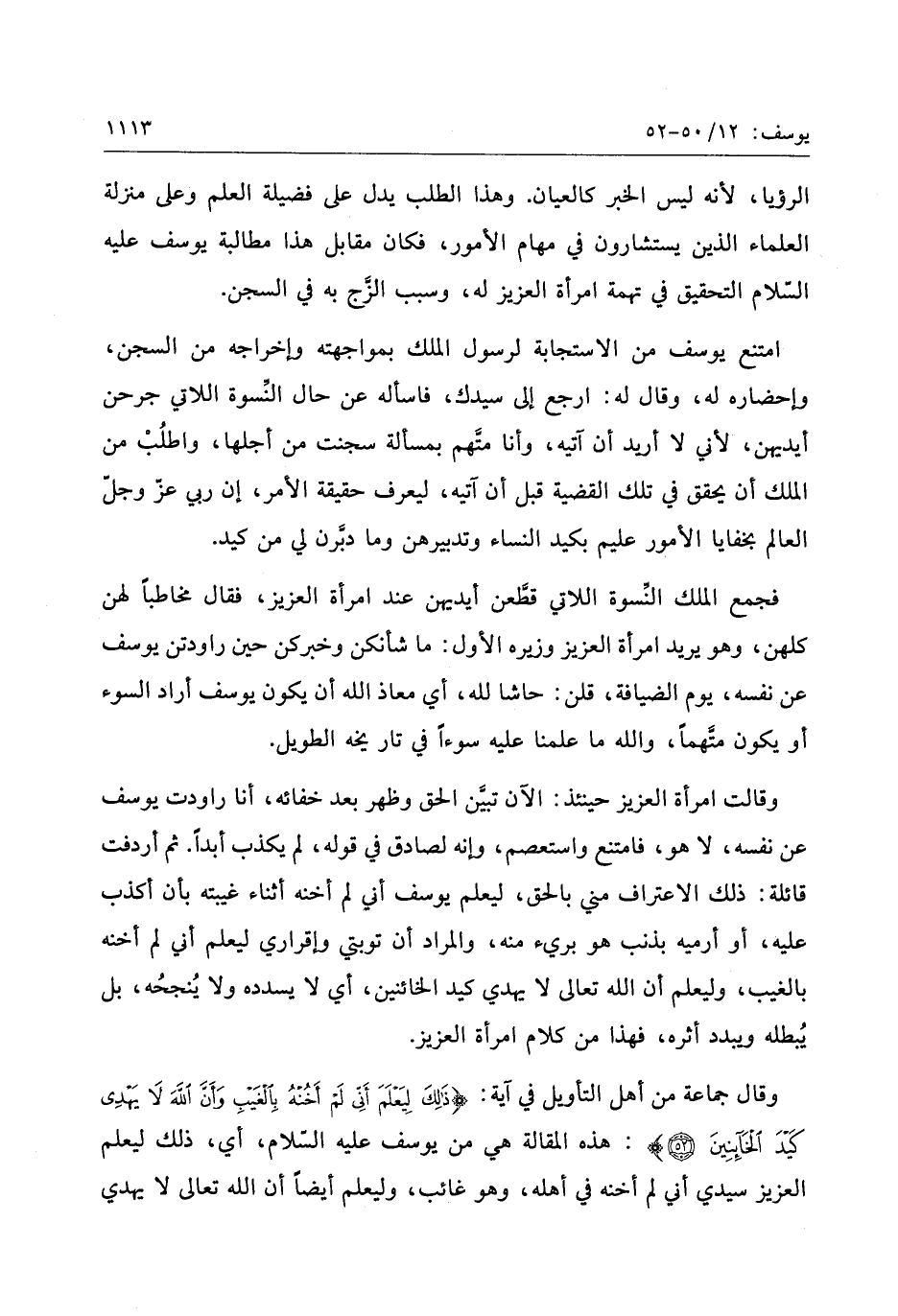 وقال جماعة من أهل التأويل في آية: ذلِكَ لِيَعْلَمَ أَنِّي لَمْ أَخُنْهُ بِالْغَيْبِ وَأَنَّ اللَّهَ لا يَهْدِي كَيْدَ الْخائِنِينَ (52) : هذه المقالة هي من يوسف عليه السّلام، أي، ذلك ليعلم العزيز سيدي أني لم أخنه في أهله، وهو غائب، وليعلم أيضا أن الله تعالى لا يهدي
