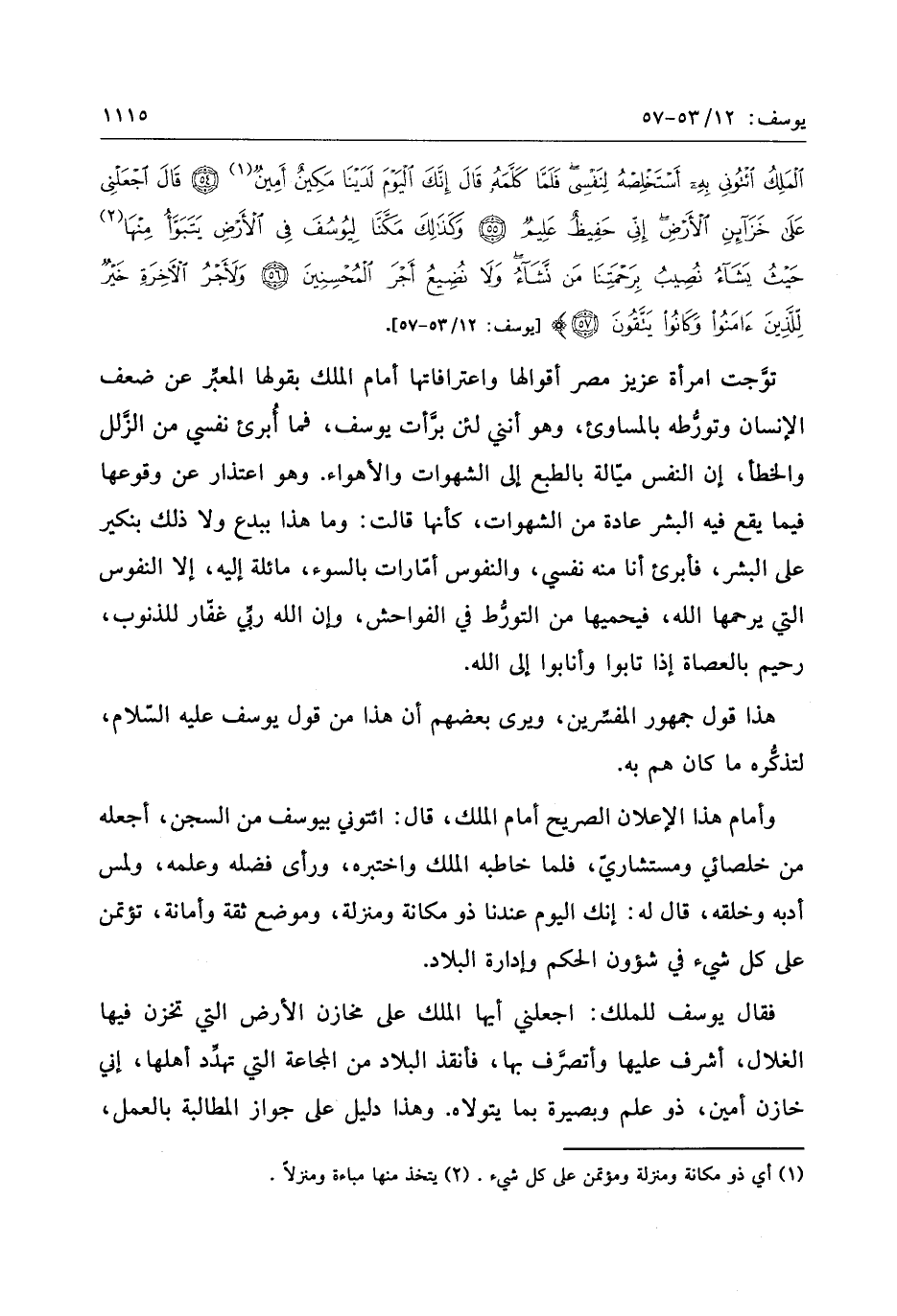 توّجت امرأة عزيز مصر أقوالها واعترافاتها أمام الملك بقولها المعبّر عن ضعف الإنسان وتورّطه بالمساوئ، وهو أنني لئن برّأت يوسف، فما أبرئ نفسي من الزّلل والخطأ، إن النفس ميّالة بالطبع إلى الشهوات والأهواء. وهو اعتذار عن وقوعها فيما يقع فيه البشر عادة من الشهوات، كأنها قالت: وما هذا ببدع ولا ذلك بنكير على البشر، فأبرئ أنا منه نفسي، والنفوس أمّارات بالسوء، مائلة إليه، إلا النفوس التي يرحمها الله، فيحميها من التورّط في الفواحش، وإن الله ربّي غفّار للذنوب، رحيم بالعصاة إذا تابوا وأنابوا إلى الله.
