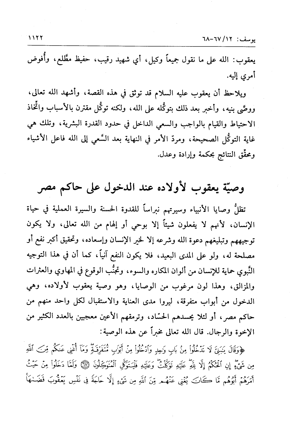 وَقالَ يا بَنِيَّ لا تَدْخُلُوا مِنْ بابٍ واحِدٍ وَادْخُلُوا مِنْ أَبْوابٍ مُتَفَرِّقَةٍ وَما أُغْنِي عَنْكُمْ مِنَ اللَّهِ مِنْ شَيْءٍ إِنِ الْحُكْمُ إِلاَّ لِلَّهِ عَلَيْهِ تَوَكَّلْتُ وَعَلَيْهِ فَلْيَتَوَكَّلِ الْمُتَوَكِّلُونَ (67) وَلَمَّا دَخَلُوا مِنْ حَيْثُ أَمَرَهُمْ أَبُوهُمْ ما كانَ يُغْنِي عَنْهُمْ مِنَ اللَّهِ مِنْ شَيْءٍ إِلاَّ حاجَةً فِي نَفْسِ يَعْقُوبَ قَضاها وَإِنَّهُ لَذُو عِلْمٍ لِما عَلَّمْناهُ وَلكِنَّ أَكْثَرَ النَّاسِ لا يَعْلَمُونَ (68)