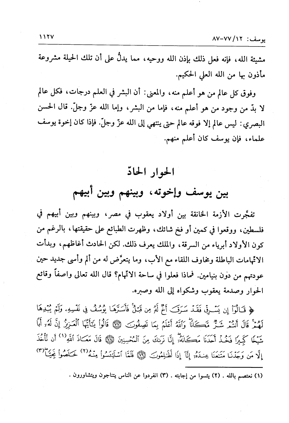 قالُوا إِنْ يَسْرِقْ فَقَدْ سَرَقَ أَخٌ لَهُ مِنْ قَبْلُ فَأَسَرَّها يُوسُفُ فِي نَفْسِهِ وَلَمْ يُبْدِها لَهُمْ قالَ أَنْتُمْ شَرٌّ مَكاناً وَاللَّهُ أَعْلَمُ بِما تَصِفُونَ (77) قالُوا يا أَيُّهَا الْعَزِيزُ إِنَّ لَهُ أَباً شَيْخاً كَبِيراً فَخُذْ أَحَدَنا مَكانَهُ إِنَّا نَراكَ مِنَ الْمُحْسِنِينَ (78) قالَ مَعاذَ اللَّهِ أَنْ نَأْخُذَ إِلاَّ مَنْ وَجَدْنا مَتاعَنا عِنْدَهُ إِنَّا إِذاً لَظالِمُونَ (79) فَلَمَّا اسْتَيْأَسُوا مِنْهُ خَلَصُوا نَجِيًّا قالَ كَبِيرُهُمْ أَلَمْ تَعْلَمُوا أَنَّ أَباكُمْ قَدْ أَخَذَ عَلَيْكُمْ مَوْثِقاً مِنَ اللَّهِ وَمِنْ قَبْلُ ما فَرَّطْتُمْ فِي يُوسُفَ فَلَنْ أَبْرَحَ الْأَرْضَ حَتَّى يَأْذَنَ لِي أَبِي أَوْ يَحْكُمَ اللَّهُ لِي وَهُوَ خَيْرُ الْحاكِمِينَ (80) ارْجِعُوا إِلى أَبِيكُمْ فَقُولُوا يا أَبانا إِنَّ ابْنَكَ سَرَقَ وَما شَهِدْنا إِلاَّ بِما عَلِمْنا وَما كُنَّا لِلْغَيْبِ حافِظِينَ (81)