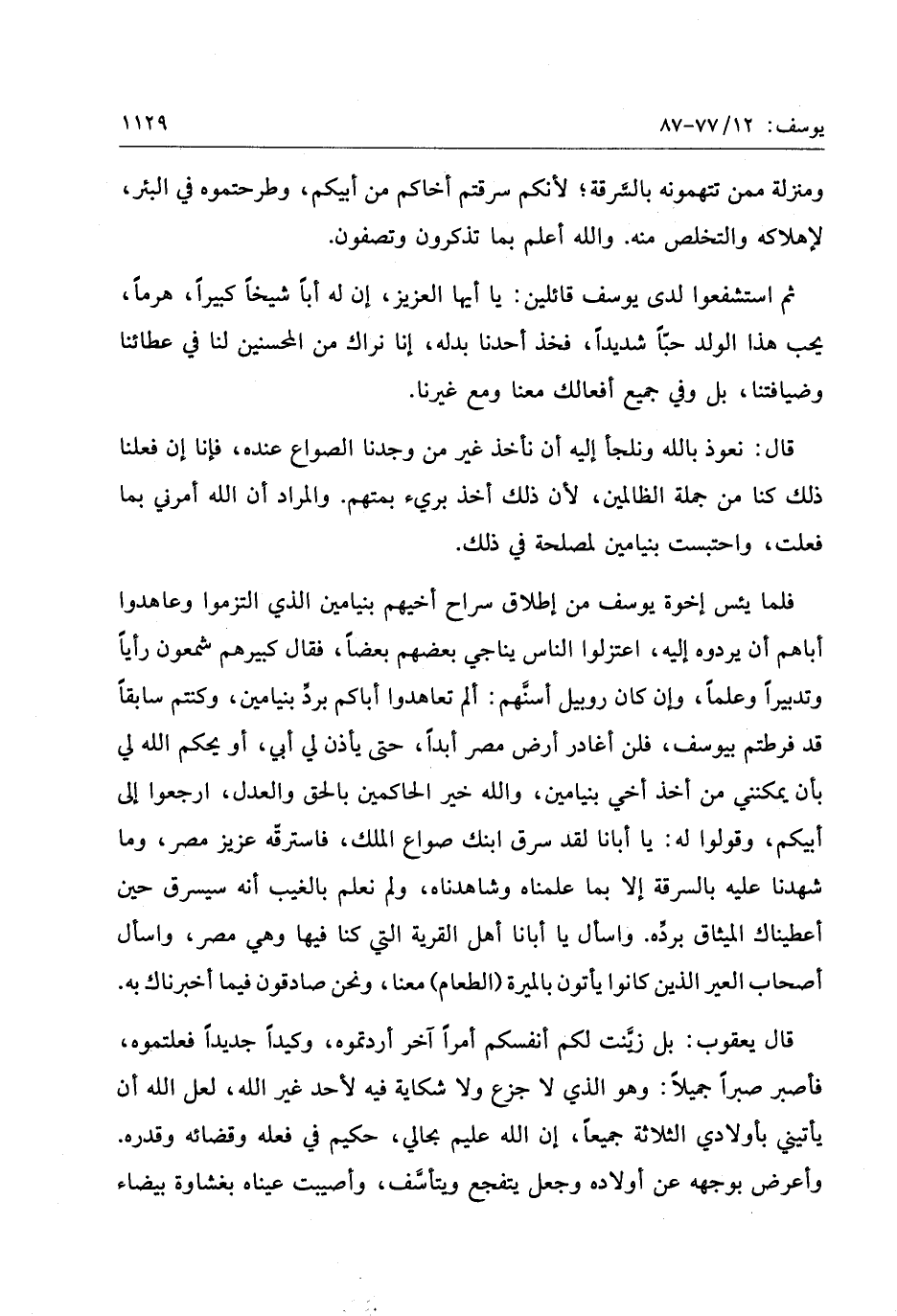 ثم استشفعوا لدى يوسف قائلين: يا أيها العزيز، إن له أبا شيخا كبيرا، هرما، يحب هذا الولد حبّا شديدا، فخذ أحدنا بدله، إنا نراك من المحسنين لنا في عطائنا وضيافتنا، بل وفي جميع أفعالك معنا ومع غيرنا.