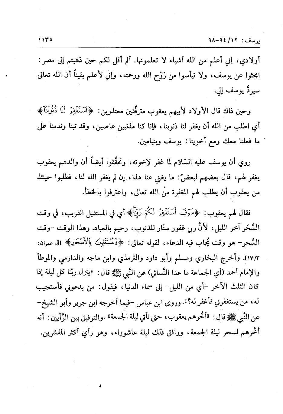 فقال لهم يعقوب: سَوْفَ أَسْتَغْفِرُ لَكُمْ رَبِّي أي في المستقبل القريب، في وقت السّحر آخر الليل، لأنّ ربي غفور ستّار للذنوب، رحيم بالعباد. وهذا الوقت- وقت السّحر- هو وقت يجاب فيه الدعاء، لقوله تعالى: وَالْمُسْتَغْفِرِينَ بِالْأَسْحارِ [آل عمران: