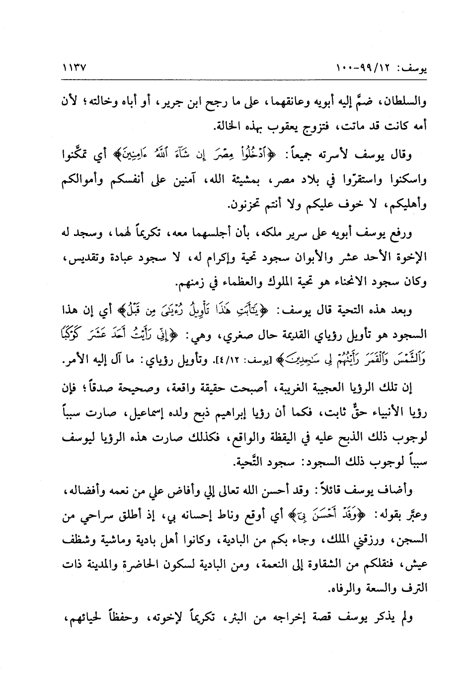 ورفع يوسف أبويه على سرير ملكه، بأن أجلسهما معه، تكريما لهما، وسجد له الإخوة الأحد عشر والأبوان سجود تحية وإكرام له، لا سجود عبادة وتقديس، وكان سجود الانحناء هو تحية الملوك والعظماء في زمنهم.