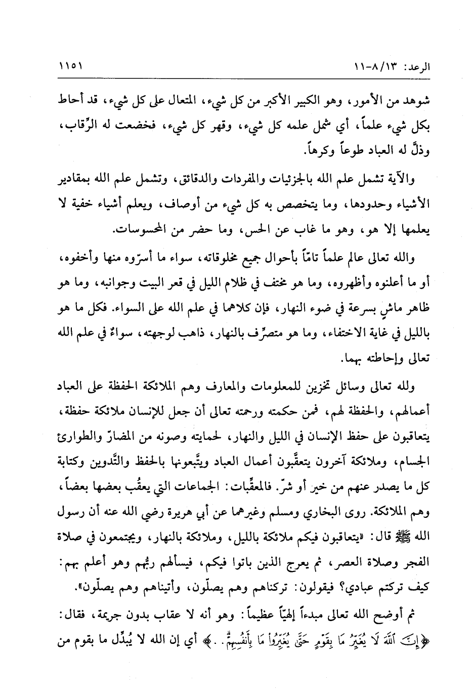 شوهد من الأمور، وهو الكبير الأكبر من كل شيء، المتعال على كل شيء، قد أحاط بكل شيء علما، أي شمل علمه كل شيء، وقهر كل شيء، فخضعت له الرّقاب، وذلّ له العباد طوعا وكرها.