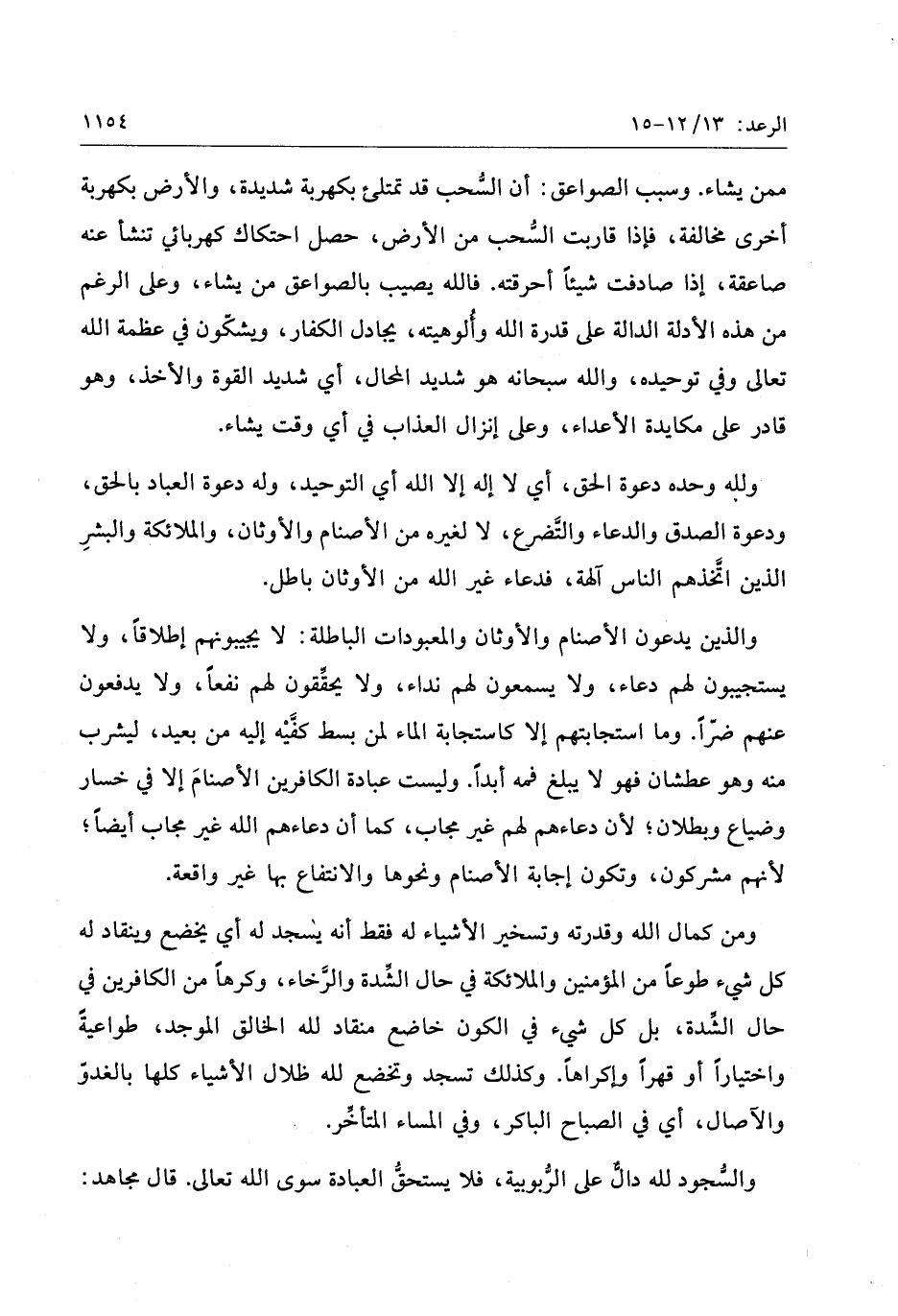 ممن يشاء. وسبب الصواعق: أن السّحب قد تمتلئ بكهربة شديدة، والأرض بكهربة أخرى مخالفة، فإذا قاربت السّحب من الأرض، حصل احتكاك كهربائي تنشأ عنه صاعقة، إذا صادفت شيئا أحرقته. فالله يصيب بالصواعق من يشاء، وعلى الرغم من هذه الأدلة الدالة على قدرة الله وألوهيته، يجادل الكفار، ويشكّون في عظمة الله تعالى وفي توحيده، والله سبحانه هو شديد المحال، أي شديد القوة والأخذ، وهو قادر على مكايدة الأعداء، وعلى إنزال العذاب في أي وقت يشاء.