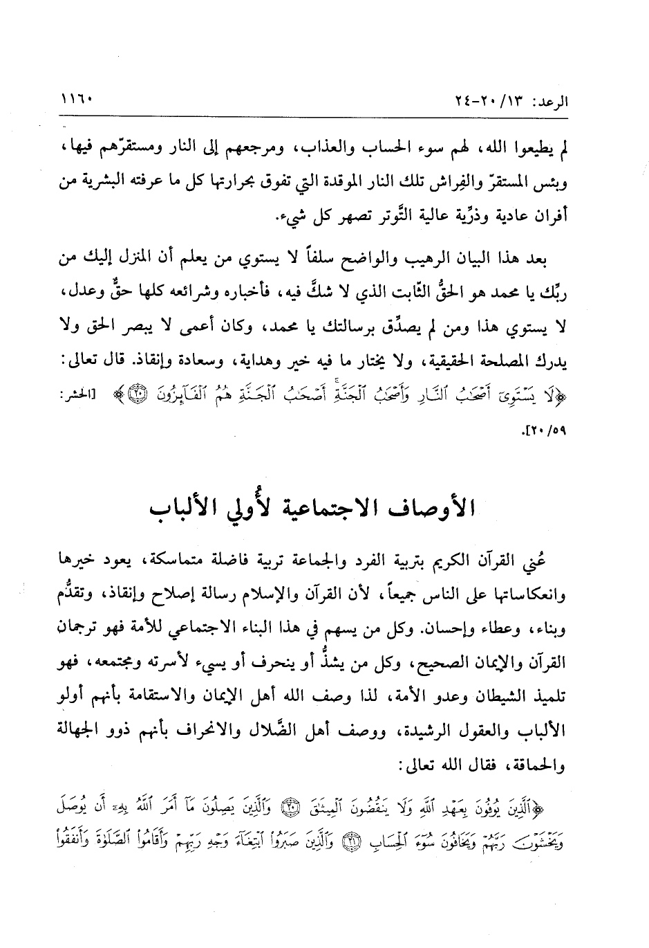 الَّذِينَ يُوفُونَ بِعَهْدِ اللَّهِ وَلا يَنْقُضُونَ الْمِيثاقَ (20) وَالَّذِينَ يَصِلُونَ ما أَمَرَ اللَّهُ بِهِ أَنْ يُوصَلَ وَيَخْشَوْنَ رَبَّهُمْ وَيَخافُونَ سُوءَ الْحِسابِ (21) وَالَّذِينَ صَبَرُوا ابْتِغاءَ وَجْهِ رَبِّهِمْ وَأَقامُوا الصَّلاةَ وَأَنْفَقُوا مِمَّا رَزَقْناهُمْ سِرًّا وَعَلانِيَةً وَيَدْرَؤُنَ بِالْحَسَنَةِ السَّيِّئَةَ أُولئِكَ لَهُمْ عُقْبَى الدَّارِ (22) جَنَّاتُ عَدْنٍ يَدْخُلُونَها وَمَنْ صَلَحَ مِنْ آبائِهِمْ وَأَزْواجِهِمْ وَذُرِّيَّاتِهِمْ وَالْمَلائِكَةُ يَدْخُلُونَ عَلَيْهِمْ مِنْ كُلِّ بابٍ (23) سَلامٌ عَلَيْكُمْ بِما صَبَرْتُمْ فَنِعْمَ عُقْبَى الدَّارِ (24)