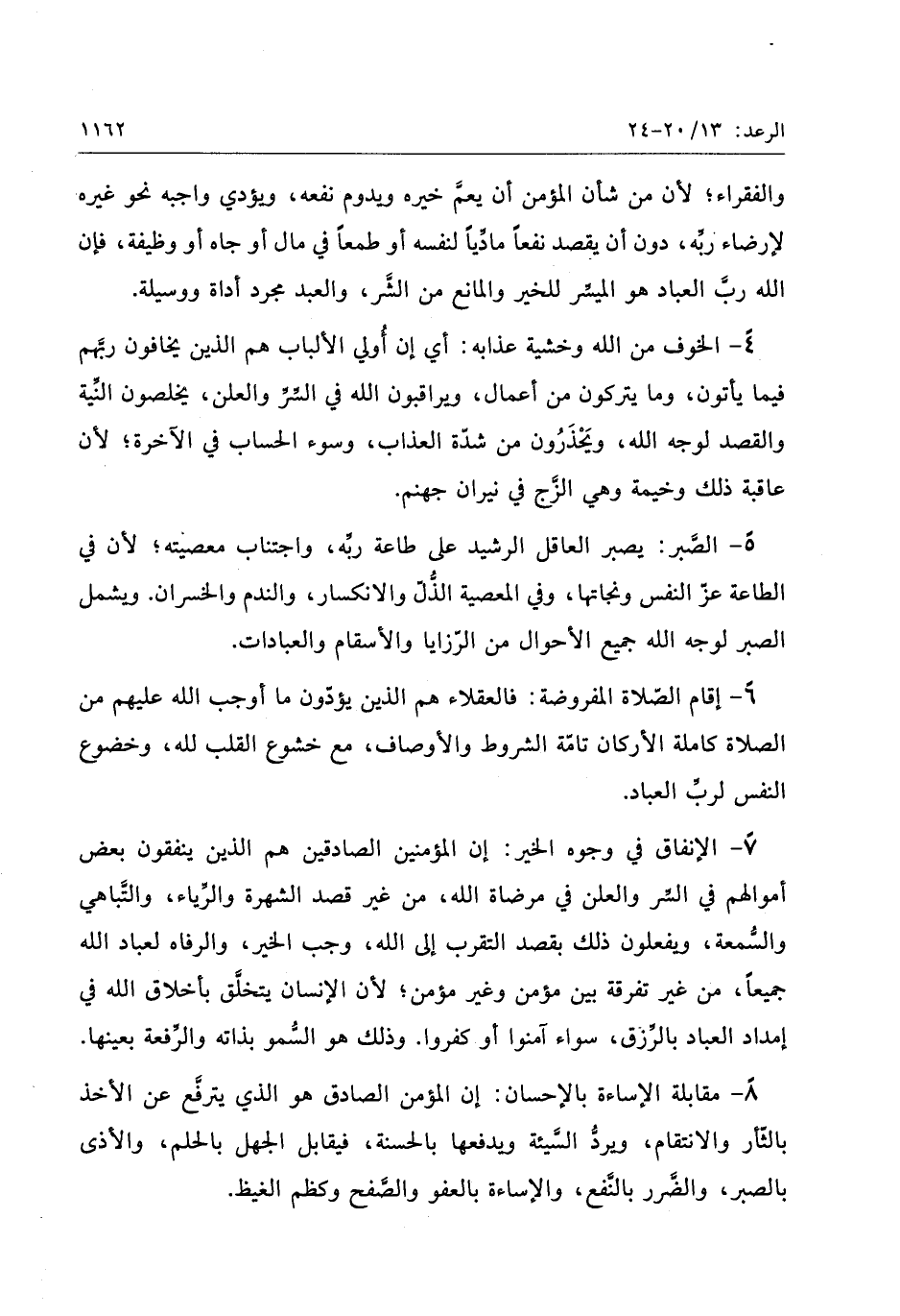 7- الإنفاق في وجوه الخير: إن المؤمنين الصادقين هم الذين ينفقون بعض أموالهم في السّر والعلن في مرضاة الله، من غير قصد الشهرة والرّياء، والتّباهي والسّمعة، ويفعلون ذلك بقصد التقرب إلى الله، وجب الخير، والرفاه لعباد الله جميعا، من غير تفرقة بين مؤمن وغير مؤمن لأن الإنسان يتخلّق بأخلاق الله في إمداد العباد بالرّزق، سواء آمنوا أو كفروا. وذلك هو السّمو بذاته والرّفعة بعينها.