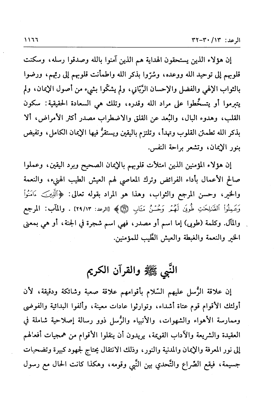 إن هؤلاء المؤمنين الذين امتلأت قلوبهم بالإيمان الصحيح وبرد اليقين، وعملوا صالح الأعمال بأداء الفرائض وترك المعاصي لهم العيش الطيب الهنيء، والنعمة والخير، وحسن المرجع والثواب، وهذا هو المراد بقوله تعالى: الَّذِينَ آمَنُوا وَعَمِلُوا الصَّالِحاتِ طُوبى لَهُمْ وَحُسْنُ مَآبٍ (29) [الرعد: 13/ 29] . والمآب: المرجع والمآل. وكلمة (طوبى) إما اسم أو مصدر، فهي اسم شجرة في الجنة، أو هي بمعنى الخير والنعمة والغبطة والعيش الطّيب للمؤمنين.