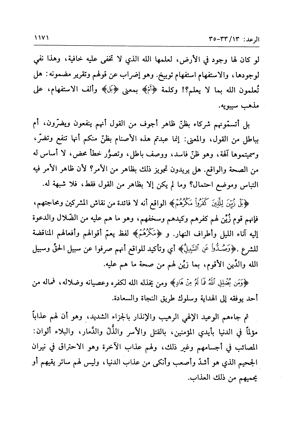 بَلْ زُيِّنَ لِلَّذِينَ كَفَرُوا مَكْرُهُمْ الواقع أنه لا فائدة من نقاش المشركين ومحاجتهم، فإنهم قوم زيّن لهم كفرهم وكيدهم وسخفهم، وهو ما هم عليه من الضّلال والدعوة إليه آناء الليل وأطراف النهار. ومَكْرُهُمْ لفظ يعمّ أقوالهم وأفعالهم المناقضة للشرع. وَصُدُّوا عَنِ السَّبِيلِ أي وتأكيد للواقع أنهم صرفوا عن سبيل الحقّ وسبيل الله والدّين الأقوم، بما زيّن لهم من صحة ما هم عليه.