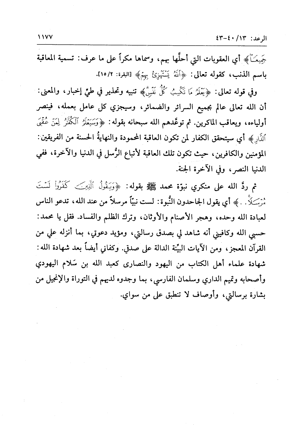 أن الله تعالى عالم بجميع السرائر والضمائر، وسيجزي كل عامل بعمله، فينصر أولياءه، ويعاقب الماكرين. ثم توعّدهم الله سبحانه بقوله: وَسَيَعْلَمُ الْكُفَّارُ لِمَنْ عُقْبَى الدَّارِ