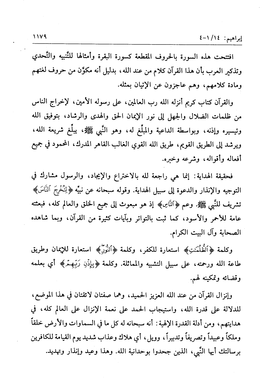 والقرآن كتاب كريم أنزله الله رب العالمين، على رسوله الأمين، لإخراج الناس من ظلمات الضلال والجهل إلى نور الإيمان الحق والهدى والرشاد، بتوفيق الله وتيسيره وإذنه، وبواسطة الداعية والمبلّغ له، وهو النّبي صلّى الله عليه وسلّم، يبلّغ شريعة الله، ويرشد إلى الطريق القويم، طريق الله القوي الغالب القاهر المدرك، المحمود في جميع أفعاله وأقواله، وشرعه وخبره.
