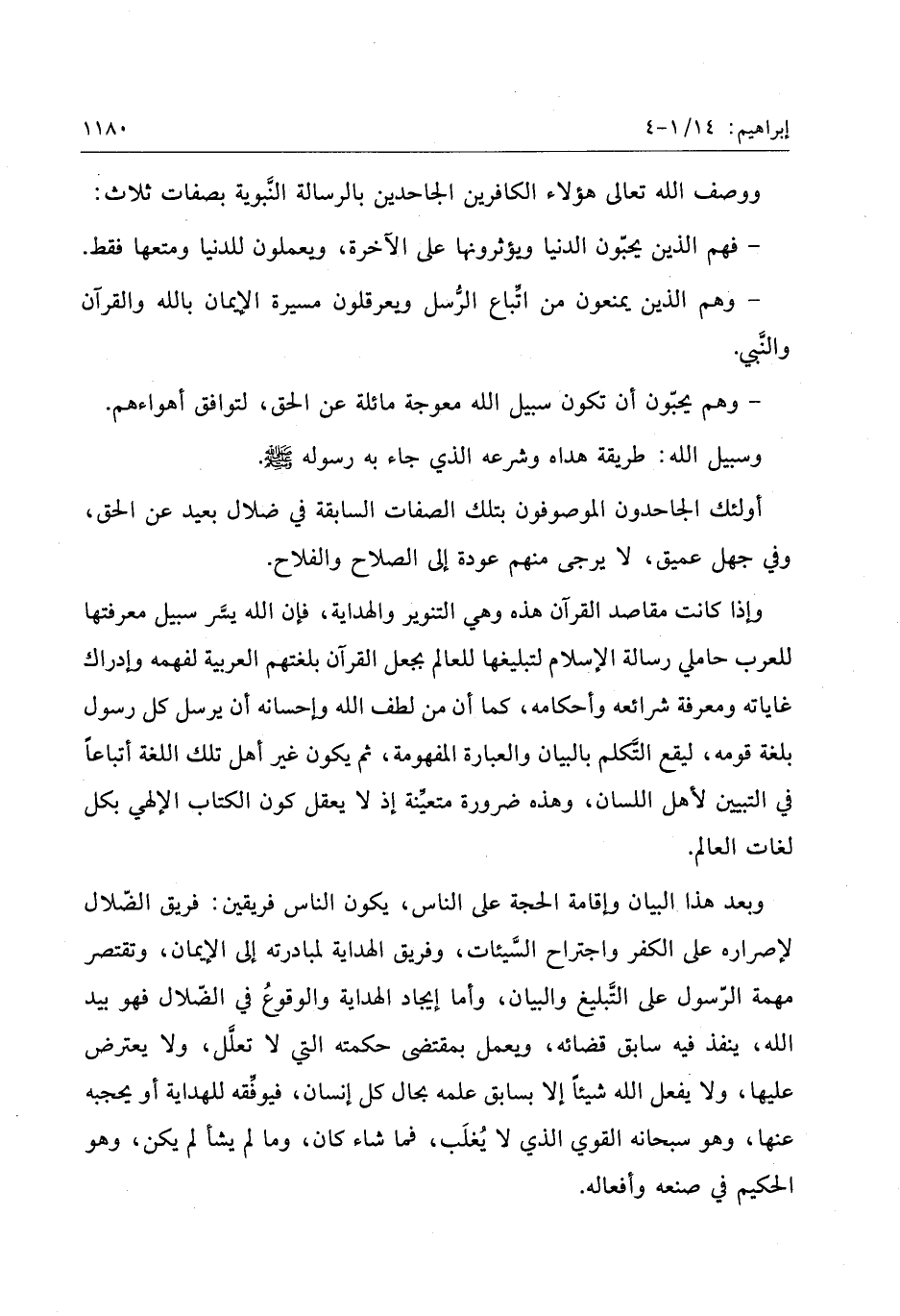 وبعد هذا البيان وإقامة الحجة على الناس، يكون الناس فريقين: فريق الضّلال لإصراره على الكفر واجتراح السّيئات، وفريق الهداية لمبادرته إلى الإيمان، وتقتصر مهمة الرّسول على التّبليغ والبيان، وأما إيجاد الهداية والوقوع في الضّلال فهو بيد الله، ينفذ فيه سابق قضائه، ويعمل بمقتضى حكمته التي لا تعلّل، ولا يعترض عليها، ولا يفعل الله شيئا إلا بسابق علمه بحال كل إنسان، فيوفّقه للهداية أو يحجبه عنها، وهو سبحانه القوي الذي لا يغلب، فما شاء كان، وما لم يشأ لم يكن، وهو الحكيم في صنعه وأفعاله.