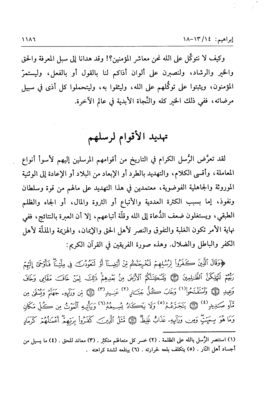 وَقالَ الَّذِينَ كَفَرُوا لِرُسُلِهِمْ لَنُخْرِجَنَّكُمْ مِنْ أَرْضِنا أَوْ لَتَعُودُنَّ فِي مِلَّتِنا فَأَوْحى إِلَيْهِمْ رَبُّهُمْ لَنُهْلِكَنَّ الظَّالِمِينَ (13) وَلَنُسْكِنَنَّكُمُ الْأَرْضَ مِنْ بَعْدِهِمْ ذلِكَ لِمَنْ خافَ مَقامِي وَخافَ وَعِيدِ (14) وَاسْتَفْتَحُوا وَخابَ كُلُّ جَبَّارٍ عَنِيدٍ (15) مِنْ وَرائِهِ جَهَنَّمُ وَيُسْقى مِنْ ماءٍ صَدِيدٍ (16) يَتَجَرَّعُهُ وَلا يَكادُ يُسِيغُهُ وَيَأْتِيهِ الْمَوْتُ مِنْ كُلِّ مَكانٍ وَما هُوَ بِمَيِّتٍ وَمِنْ وَرائِهِ عَذابٌ غَلِيظٌ (17)